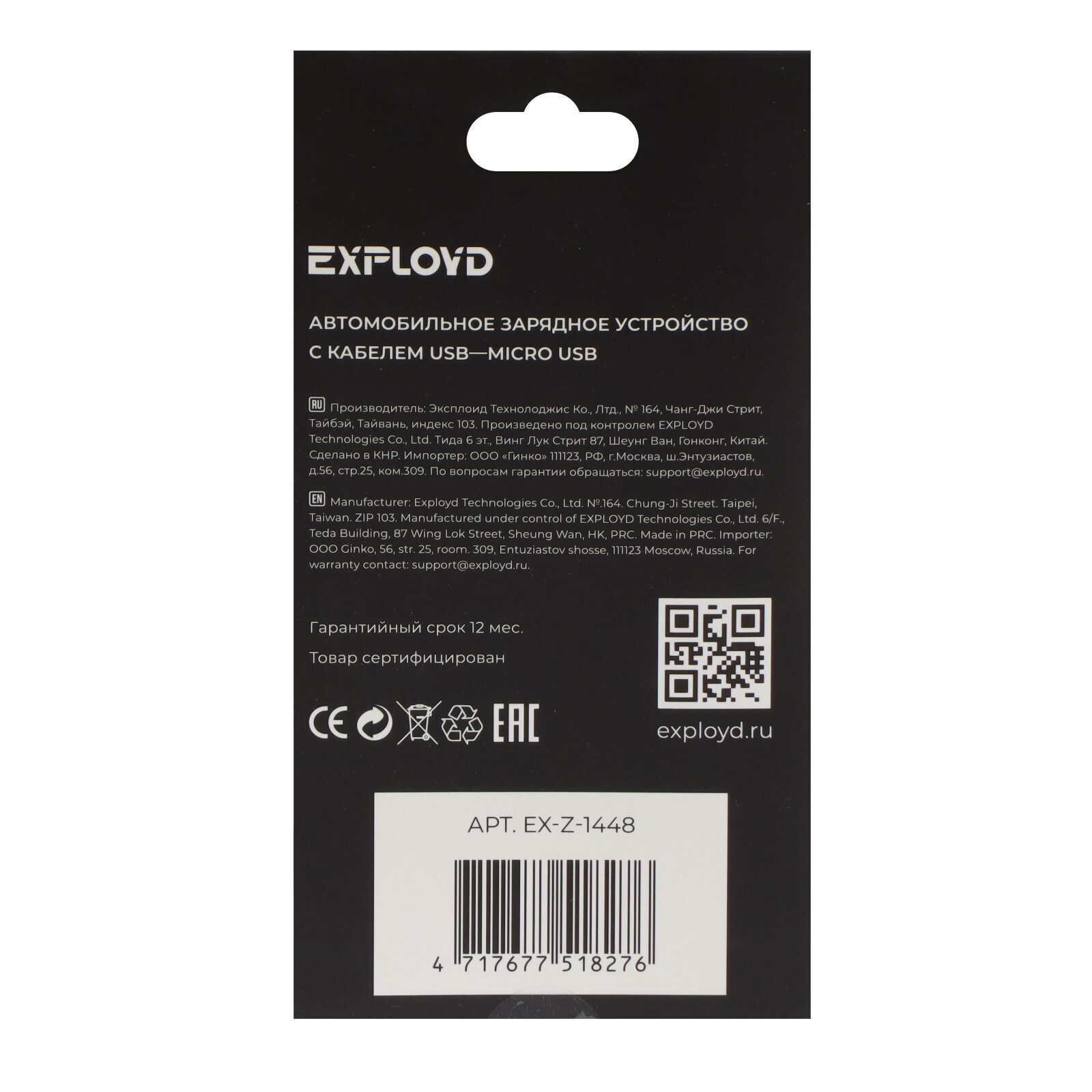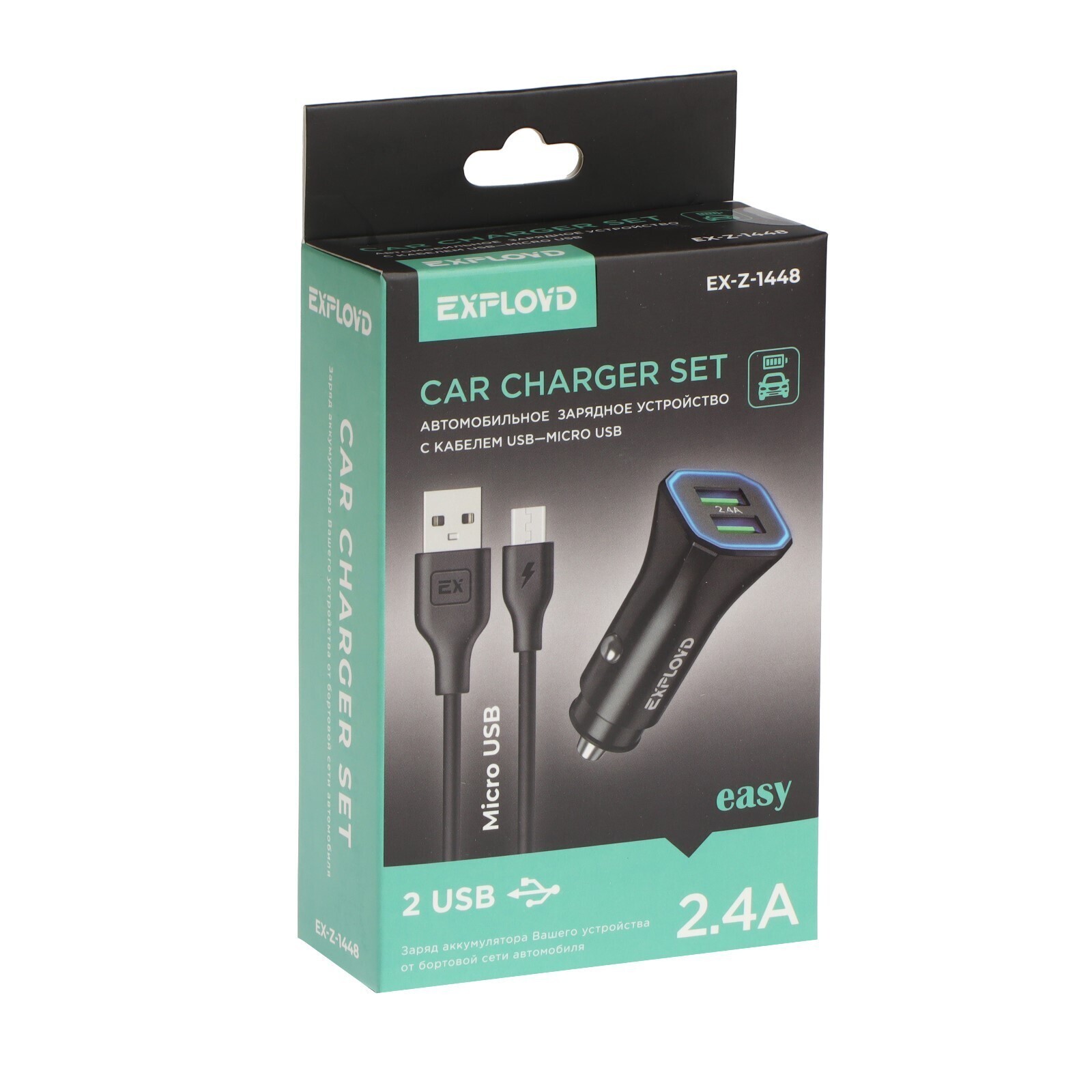 Автомобильное зарядное устройство Exployd EX-Z-1448, 2 USB, 2.4А,кабель microUSB, 1м, черное