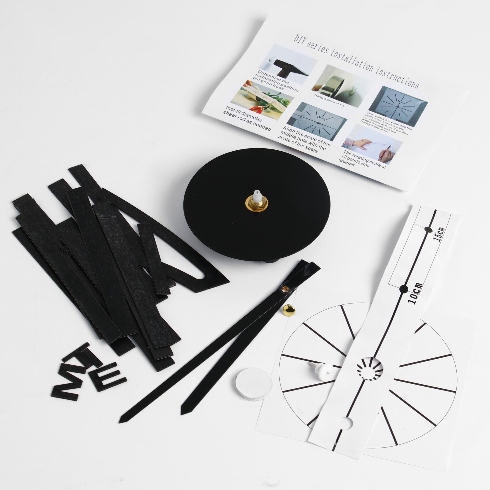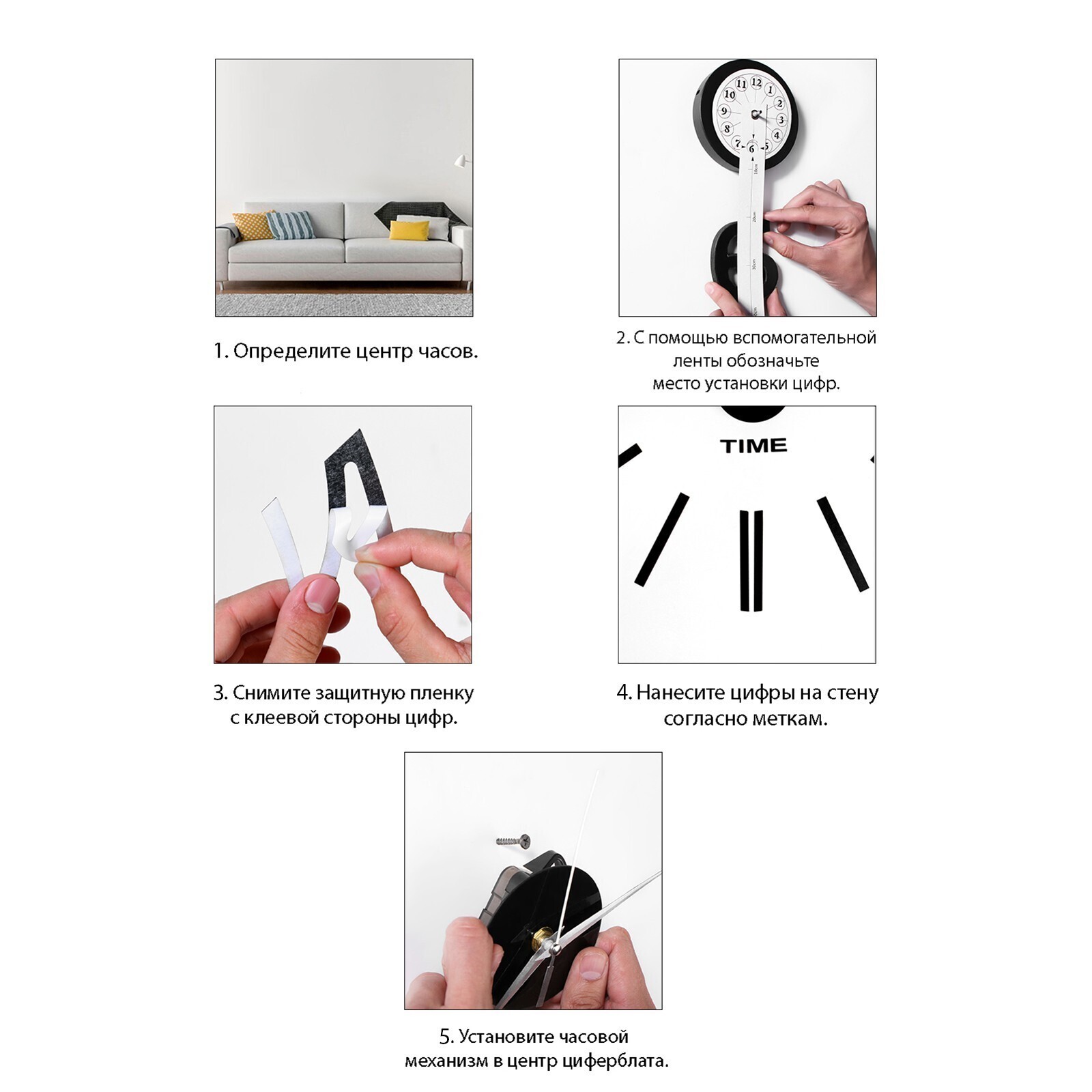Создавайте часы в собственном стиле, проявляйте изобретательность и креативность. Не обязательно располагать числа по кругу — придайте аксессуару необычную форму, поменяйте диаметр циферблата, используйте не все элементы. Комплектующие легко клеятся на стену и без труда снимаются.