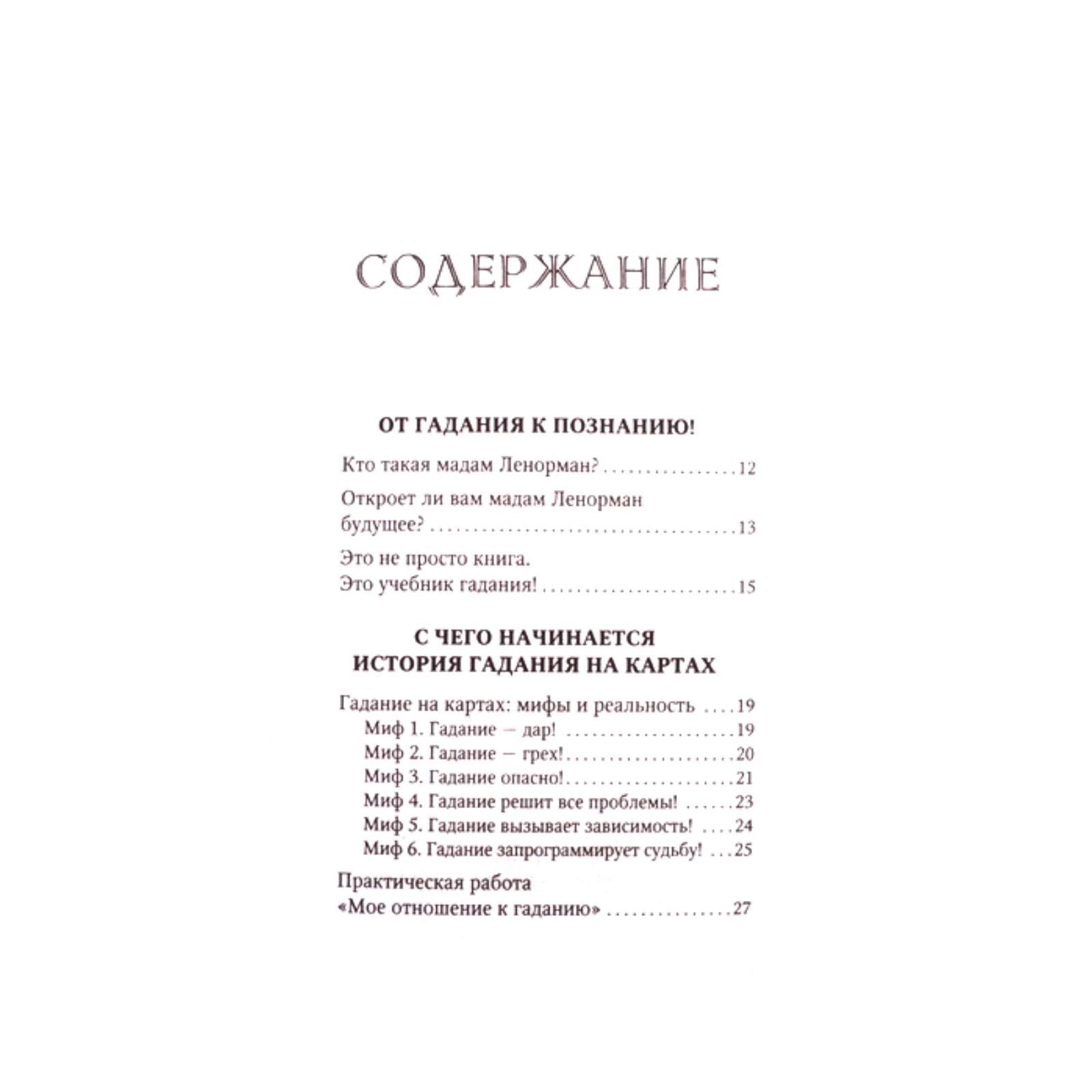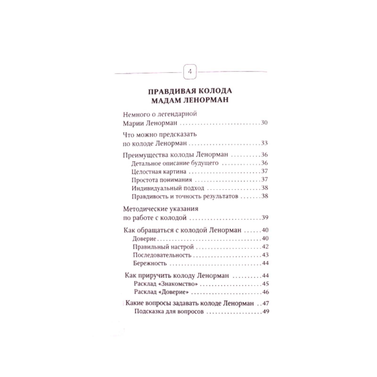 Она предсказала судьбу Марии - Антуанетте и свадьбу с коронованной особой Жозефине Богарне, будущей жене Наполеона, к ее советам с вниманием прислушивался русский император Александр I. Эта великая женщина создала свою систему гадания и свою предсказательную колоду, которая стала одной из самых востребованных в мире. Изучив систему гадания Марии Ленорман, вы сможете сделать точные предсказания и даже составить детальное описание будущих событий (на день, неделю, месяц, год, несколько лет). Специальные расклады, которые вы найдёте в книге, помогут получить ответы на сложные вопросы, спрогнозировать развитие любых отношений, узнать, какие люди вас окружают и что они о вас думают.