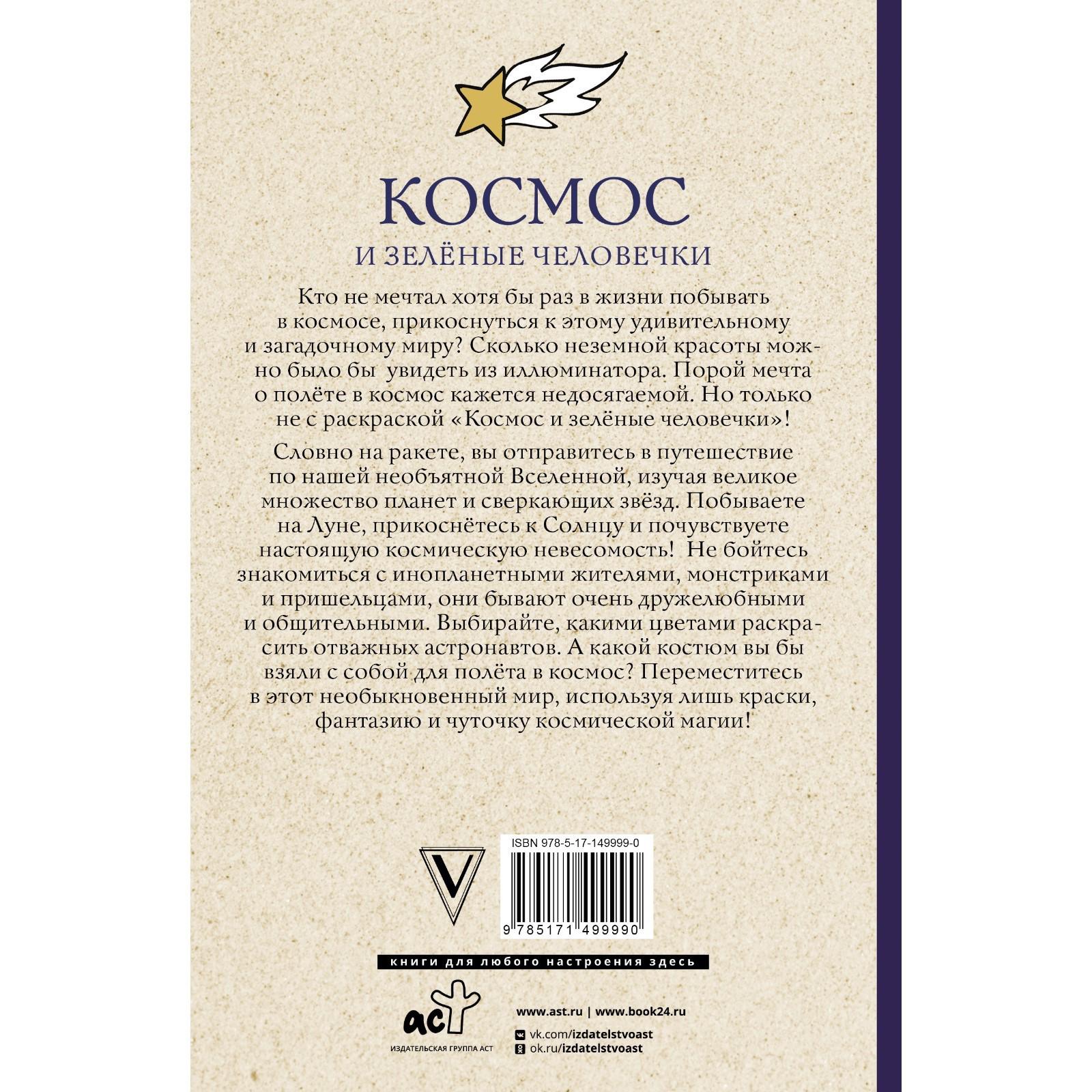 Словно на ракете, Вы отправитесь в путешествие по нашей необъятной вселенной, изучая великое множество планет и сверкающих звёзд. Побываете на Луне, прикоснетесь к Солнцу и почувствуете настоящую космическую невесомость! Не бойтесь знакомиться с инопланетными жителями, монстриками и пришельцами, они бывают очень дружелюбными и общительными. Выбирайте, какими цветами раскрасить отважных астронавтов. А какой костюм Вы бы взяли с собой для полёта в космос? Переместитесь в этот необыкновенный мир, использвуя лишь краски, фантазию и чуточку космической магии!