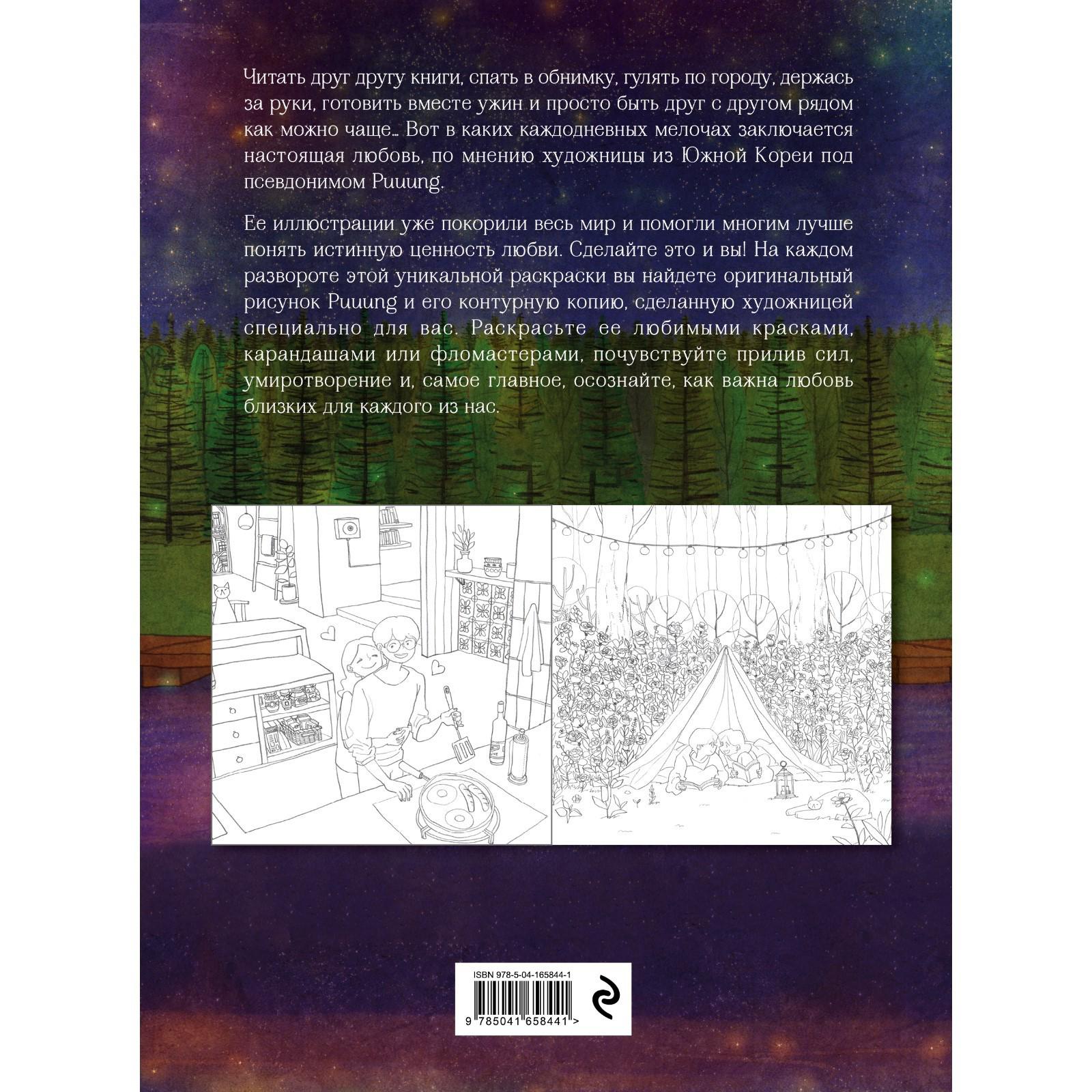 Что такое любовь? В чем она проявляется? Художница из Южной Кореи под псевдонимом Puuung, автор этой раскраски, считает, что настоящую любовь можно узнать по желанию всегда быть рядом и каждодневным знакам внимания. Среди них есть такие мелочи, как, например, прогулки по городу, сон в обнимку, совместное чтение книг и приготовление ужина. В этой раскраске собраны оригинальные рисунки Puuung, иллюстрирующие моменты из жизни влюбленных, и их контурные копии, сделанные художницей специально для вас. Раскрасьте их и почувствуйте, как хорошо и тепло становится на душе, когда сердце наполняет любовь к близким, и осознайте, что «любовь живет в мелочах».