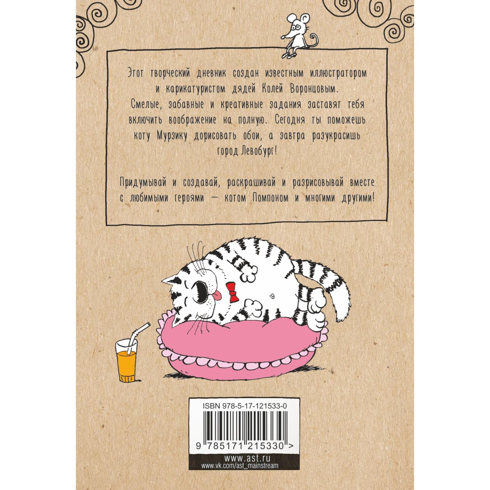 Этот творческий дневник создан известным иллюстратором и карикатуристом дядей Колей Воронцовым. Смелые, забавные и креативные задания заставят тебя включить воображение на полную. Сегодня ты поможешь коту Мурзику дорисовать обои, а завтра разукрасишь город Левобург!