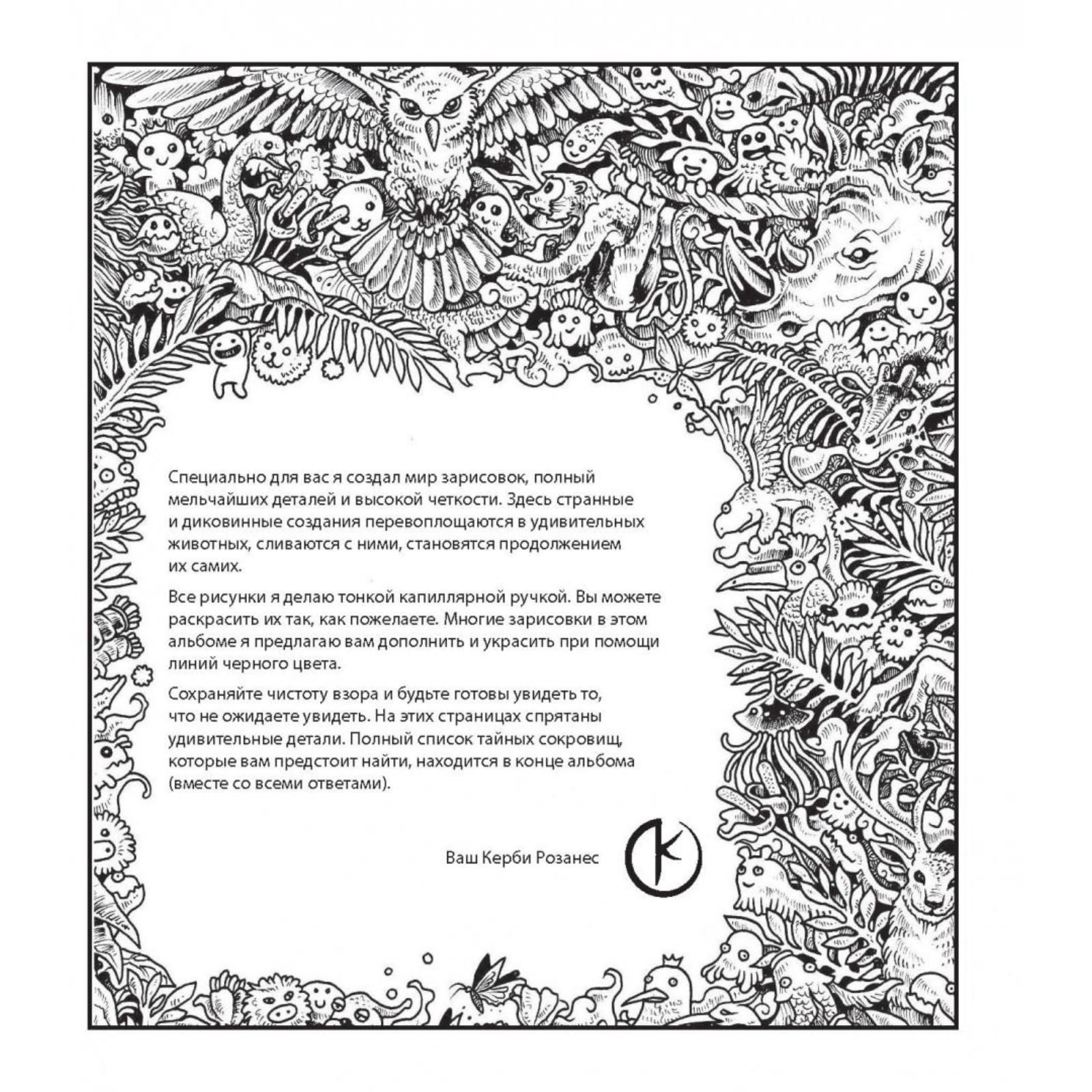 «Специально для вас я создал мир зарисовок, полный мельчайших деталей и высокой чёткости. Здесь странные и диковинные создания перевоплощаются в удивительных животных, сливаются с ними, становятся продолжением их самих. Все рисунки я делаю тонкой капиллярной ручкой. Вы можете раскрасить их так, как пожелаете. Многие зарисовки в этом альбоме я предлагаю вам дополнить и украсить при помощи линий чёрного цвета.Сохраняйте чистоту взора и будьте готовы увидеть то, что не ожидаете увидеть. На этих страницах спрятаны удивительные детали. Полный список тайных сокровищ, которые вам предстоит найти, находится в конце альбома (вместе со всеми ответами)».