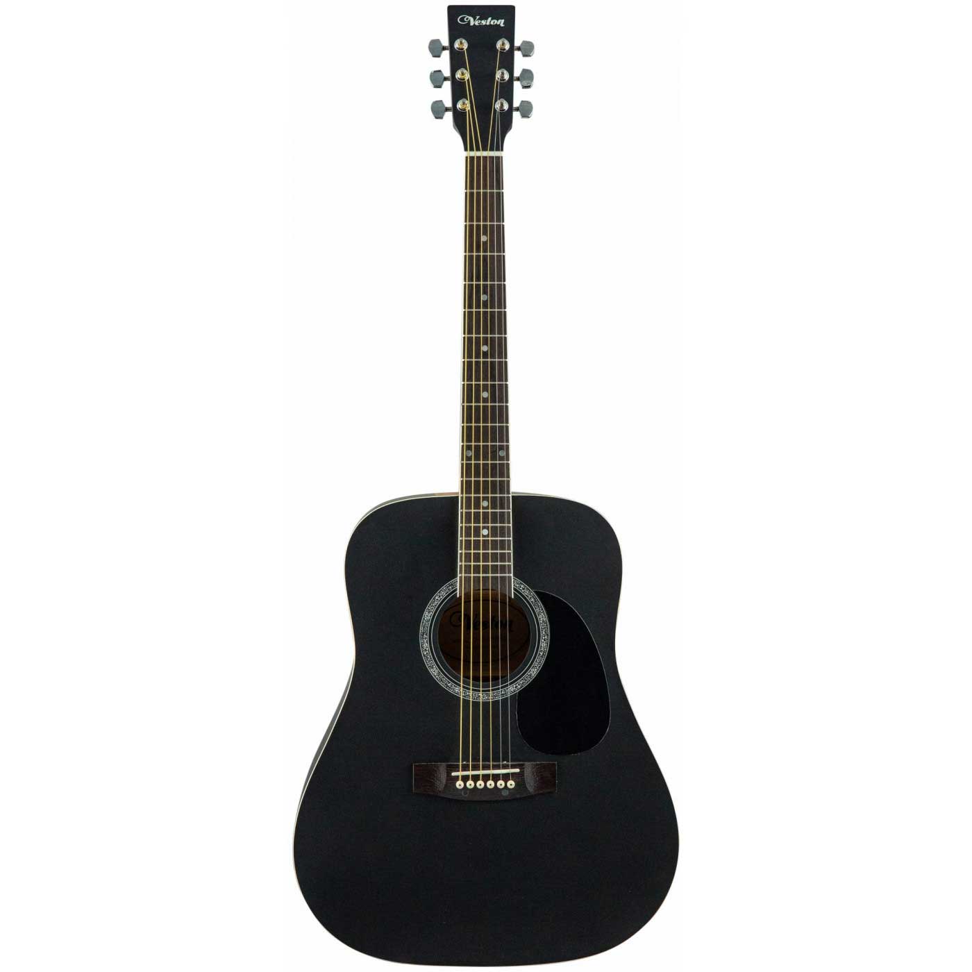 VESTON D-45 SP/BKS – акустическая гитара черного матового цвета с еловой верхней декой и корпусом из липы. Акустическая гитара VESTON D-45 SP/BKS имеет полноразмерный корпус формы Дредноут (Dreadnought) или Вестерн, придающий гитаре сильный насыщенный звук. Сходные по цене недорогие гитары VESTON F-38, представленные в трех цветах - натуральном, черном и санберст. Они имеют корпус чуть меньшего размера, это так называемые фолк - гитары. Эти инструменты также можно расссмотреть как гитару для начинающих.. VESTON D-45 SP/BKS – полноценная акустическая гитара с металлическими струнами.