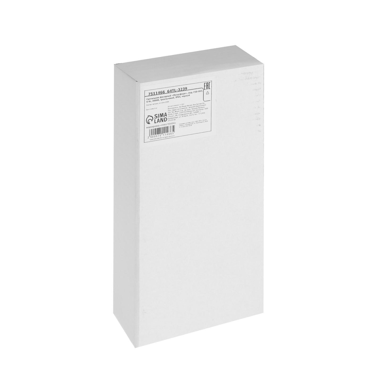 Светильник фасадный «Полусфера», 6 Вт, 3000К, трехлучевой, влагозащищенный IP65, черный