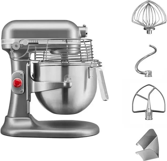 Стационарный миксер, мощность 500 Вт, количество скоростей 10, объём чаши 6.9 л, материал чаши нерж. сталь, насадки: венчики для взбивания, для теста, для пюре.