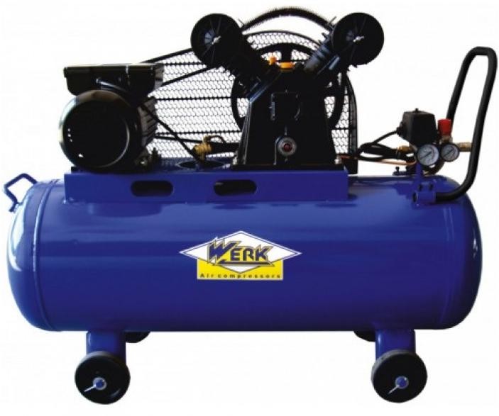 Компресор WERK VBM-2T0.4-100 зі зносостійким приводним ременем. Продуктивний мастильний компресор з ремінною передачею і ресивером на 100 л завжди знайде гідне застосування, забезпечуючи роботу пневмоінструменту і устаткуванню для фарбування або шиномонтажу. Модель WERK VBM-2T0.4-100 здатна подавати чисте стиснене повітря щодня протягом робочого дня.