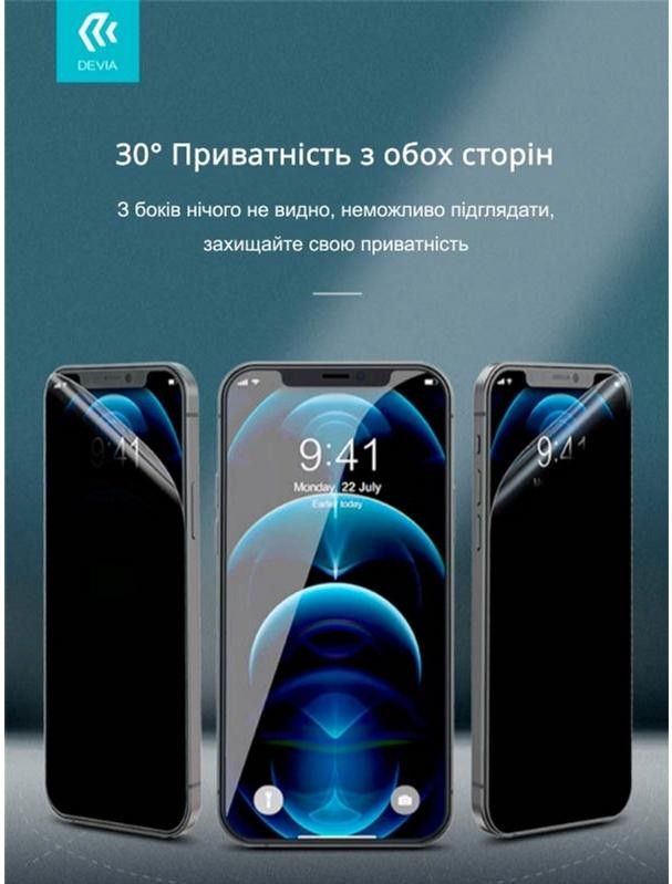 Гидрогелевая пленка Devia Privacy защитит ваш смартфон от повреждений. Не трескается при падении и не скалывается по краям. Благодаря функции анти-шпион, вы можете скрыть информацию на вашем телефоне от других людей.