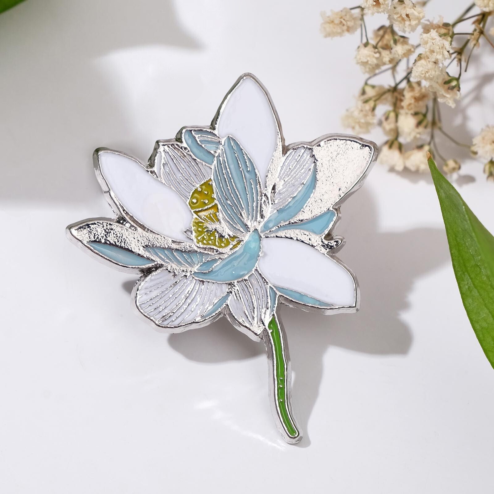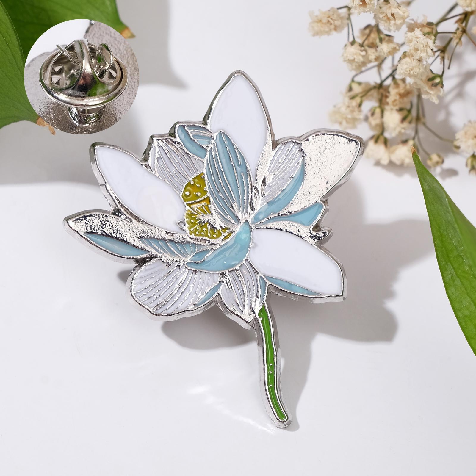 Значок "Цветок лотос", цвет бело-голубой в серебре