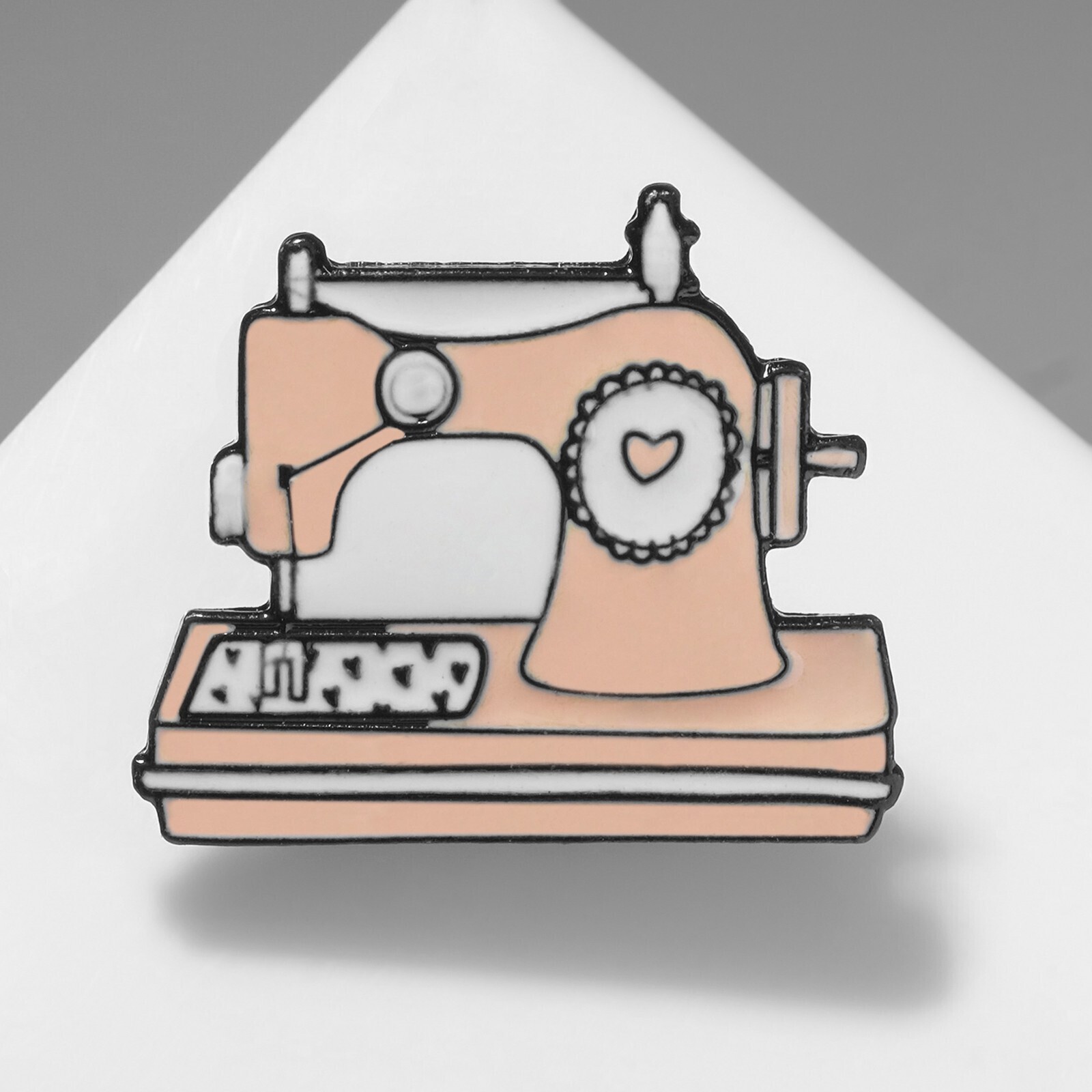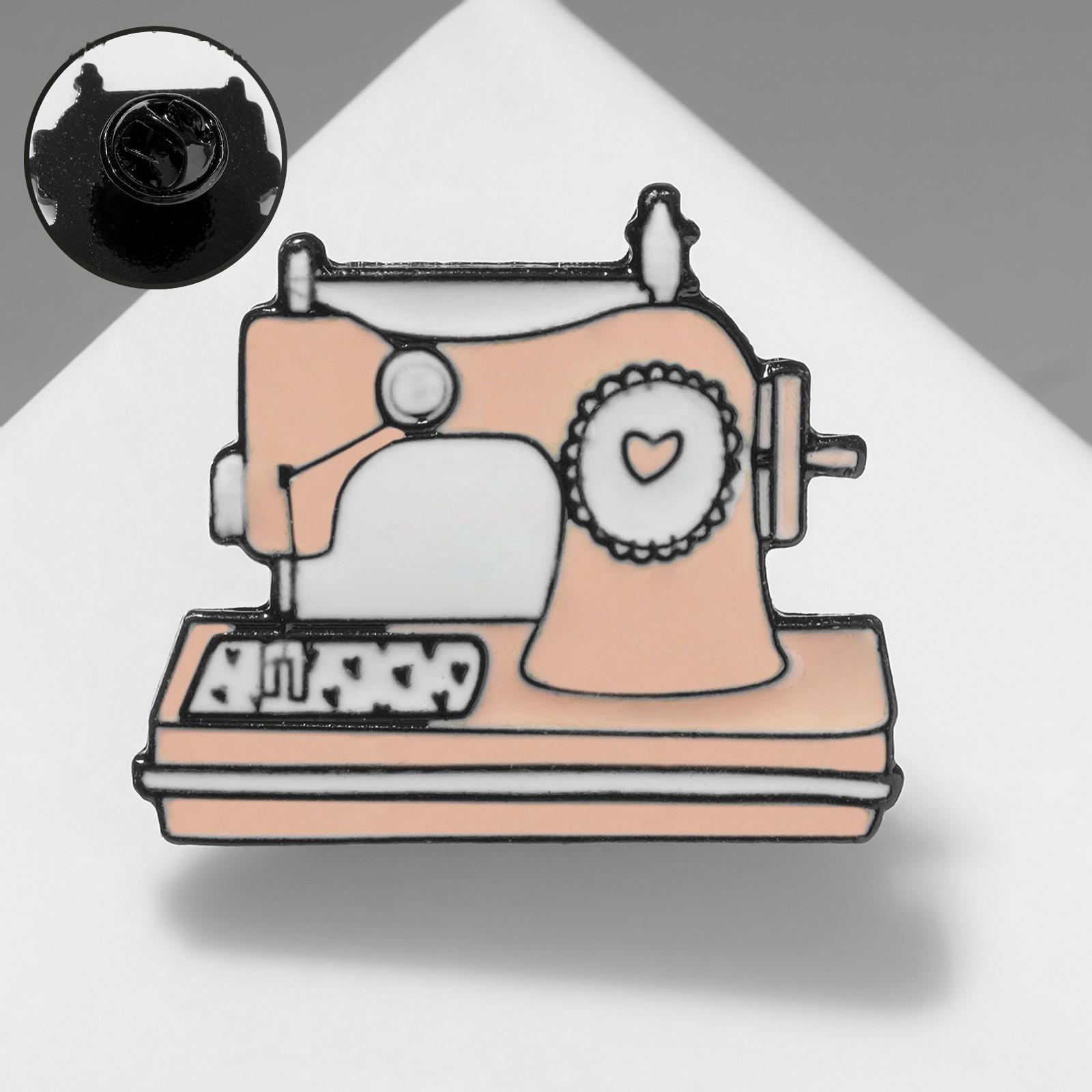 Значок "Швейная машинка" с сердцем, цвет бело-розовый в чёрном металле
