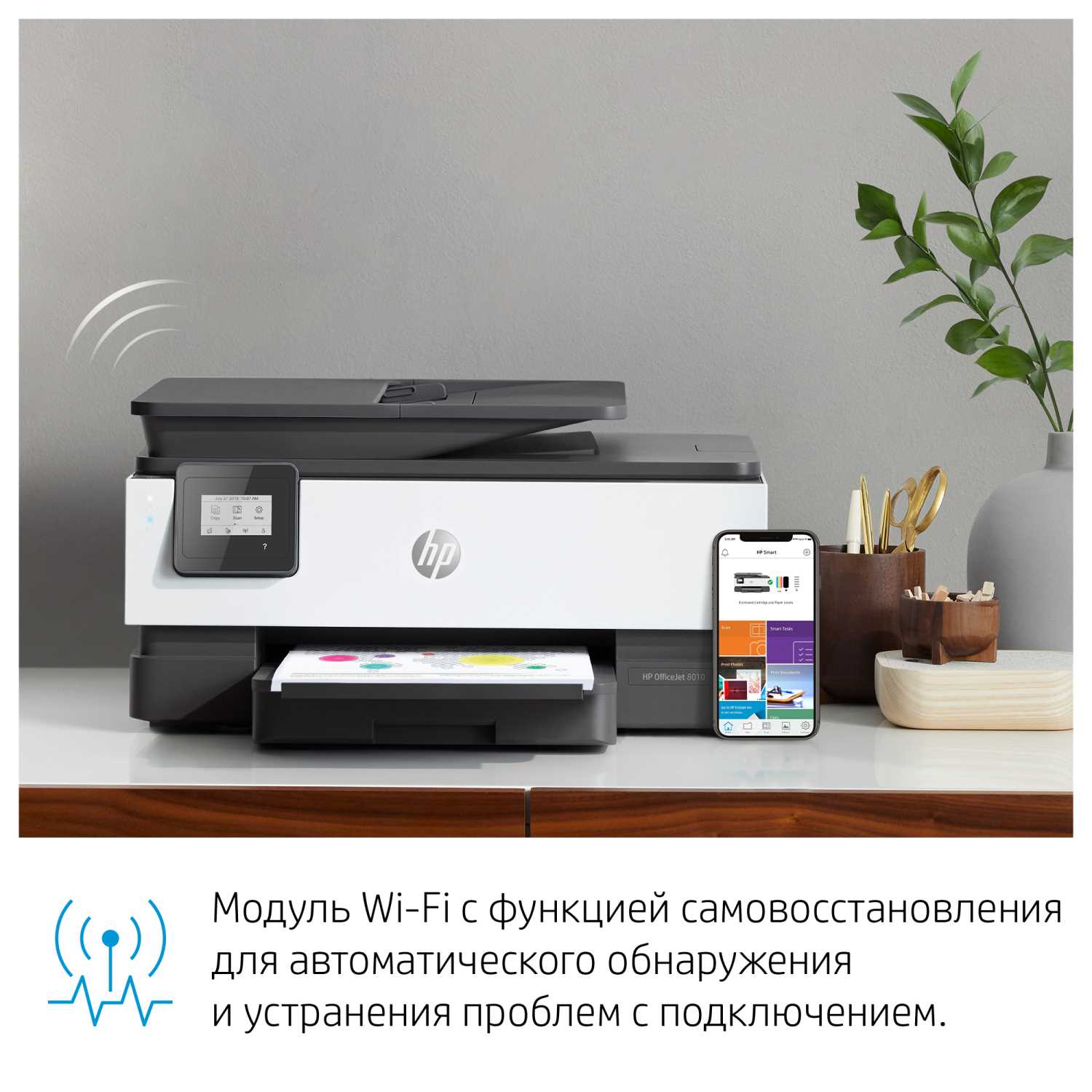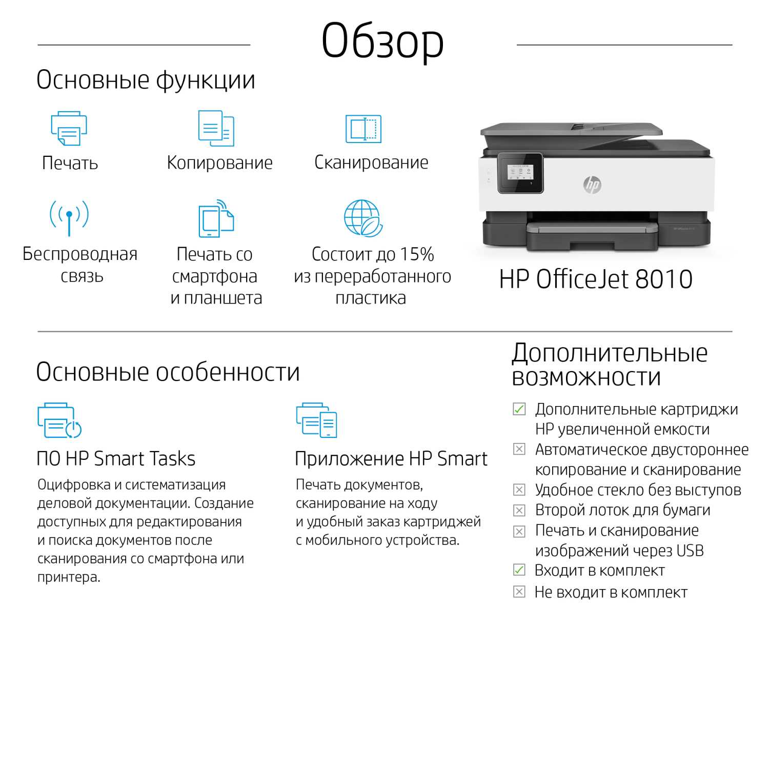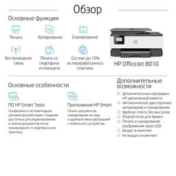 HP OfficeJet МФУ 8013, Цвет, принтер для Home (домашняя страница), Печать, копирование, сканирование, Автоподатчик на 35 листов; двусторонняя печать; монохромный графический дисплей с емкостным сенсорным экраном. Технология печати: Термическая струйная, Печать: цветная печать, Максимальное разрешение: 4800 x 1200 DPI, Скорость печати (цвет., обычное кач., A4/US Letter): 10 ppm. Копирование: цветное копирование, Максимальное разрешение копирования: 600 x 600 DPI. Сканирование: цветное сканирование, Разрешение оптического сканирования: 1200 x 1200 DPI. Максимальный размер бумаги ISO A-формата: A4. Wi-Fi. Прямая печать. Цвет товара: Черный, Белый