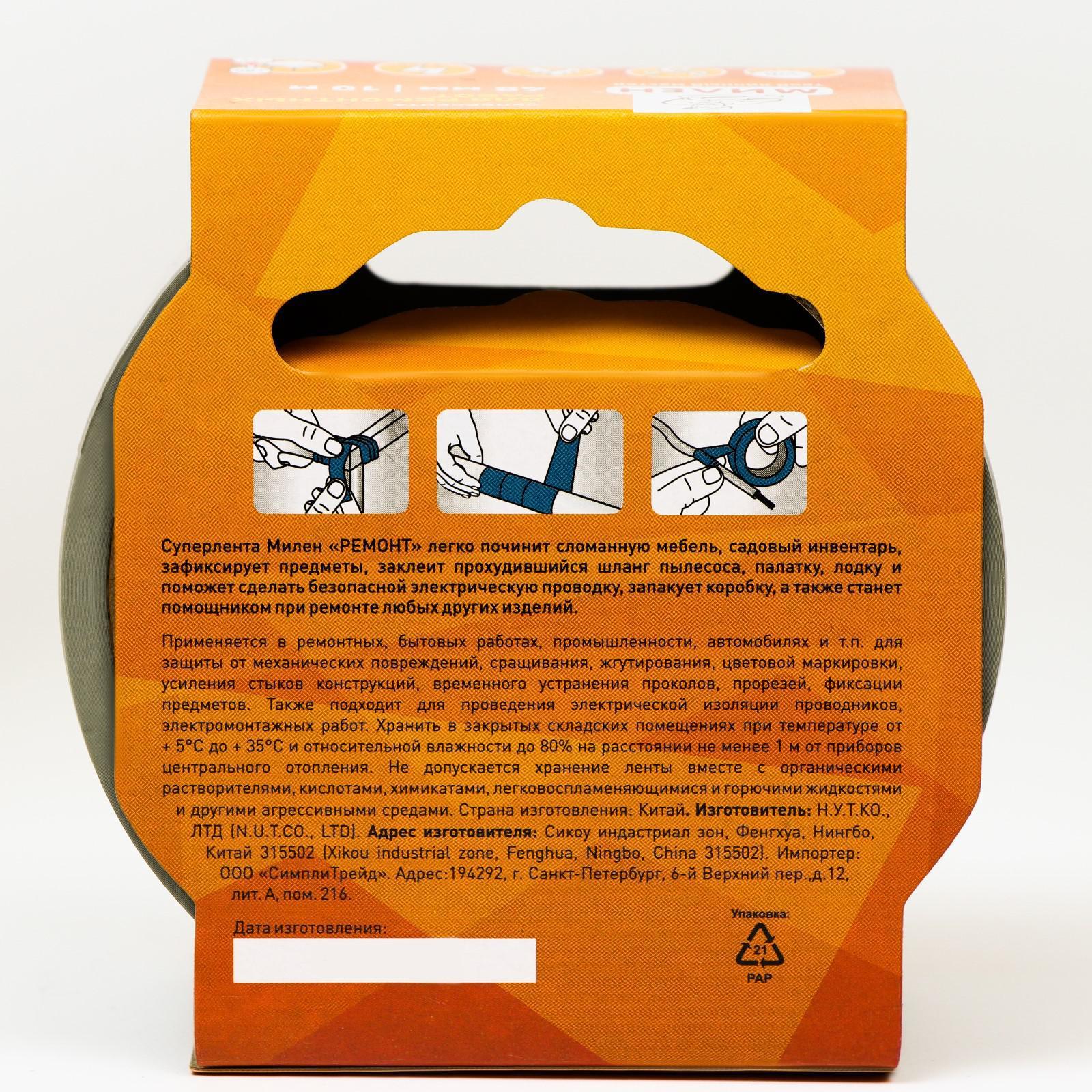 Суперлента Милен "РЕМОНТ" легко починит сломанную мебель, садовый инвентарь, зафиксирует предметы, заклеит прохудившийся шланг пылесоса, палатку, лодку и поможет сделать безопасной электрическую проводку, запакует коробку, а так же станет помощником при ремонте любых других изделий.