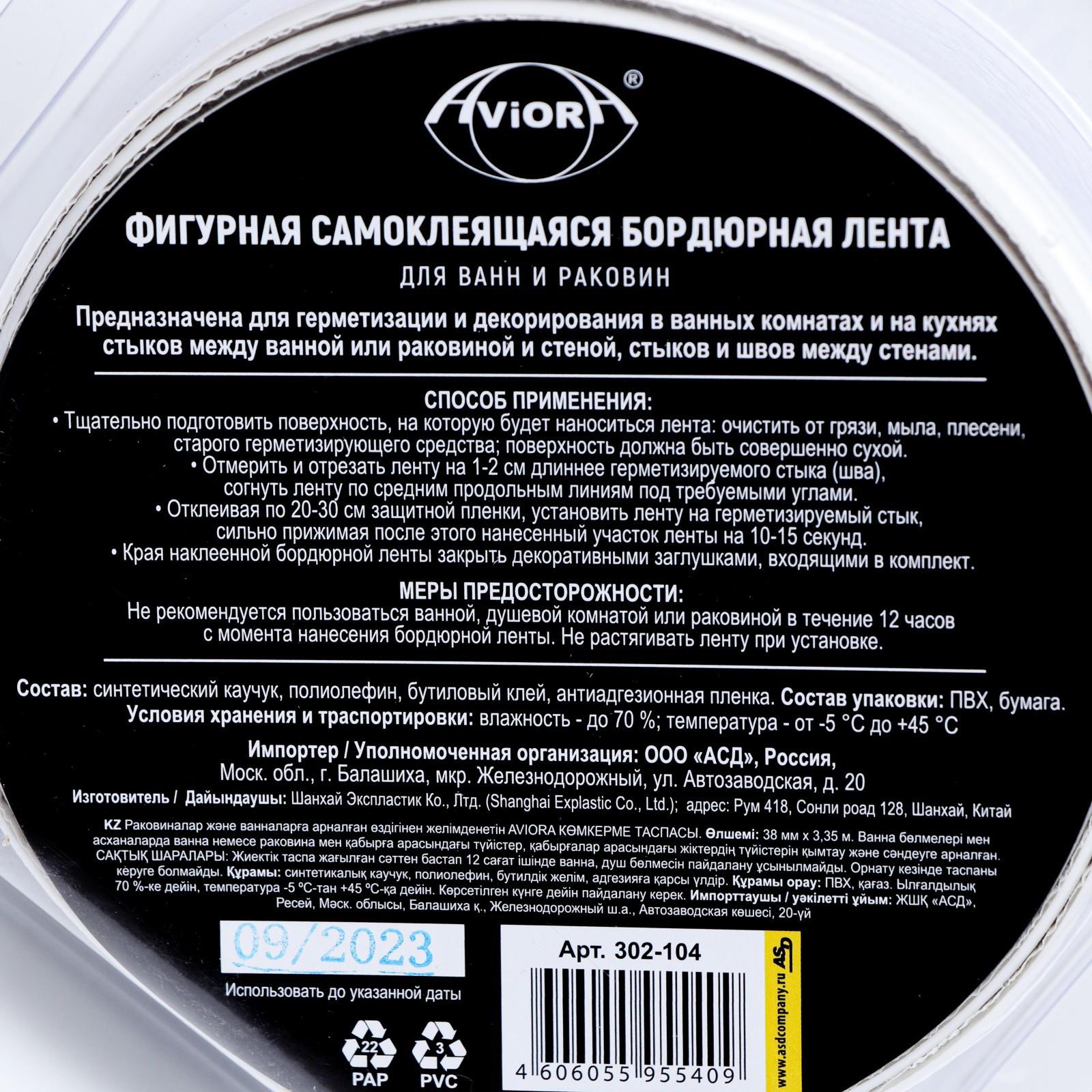 Бордюрная лента Aviora используется для герметизации стыков, для декорирования ванных комнат, душевых кабин, джакузи, кухонь. На ленту нанесен специальный бутиловый клей, который содержит добавки, препятствующие образованию грибка и плесени.