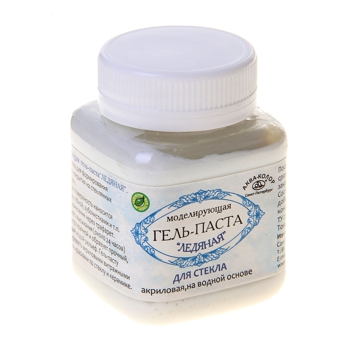 Моделирующая гель-паста «Ледяная» на водной основе, предназначенная для создания рельефного покрытия (эффекта наледи или сосулек) при декорировании стеклянных или любых других прозрачных поверхностей (изделий из оргстекла, полиэтилентерефталата, поликарбоната и др.). «Ледяная» гель-паста может быть нанесена и на любые непрозрачные поверхности (фарфор, фаянс, металл, дерево и др.), но с меньшим эффектом прозрачности.