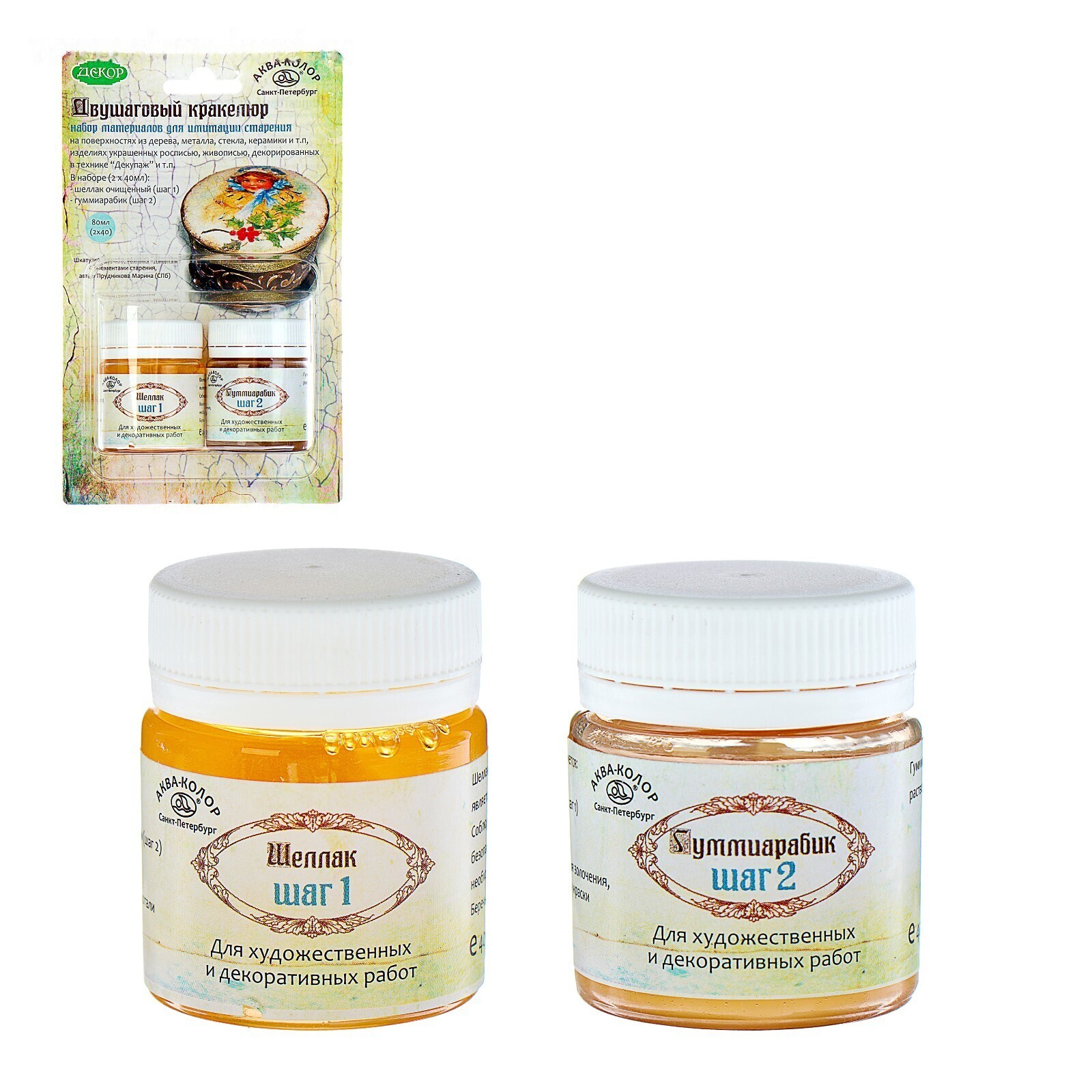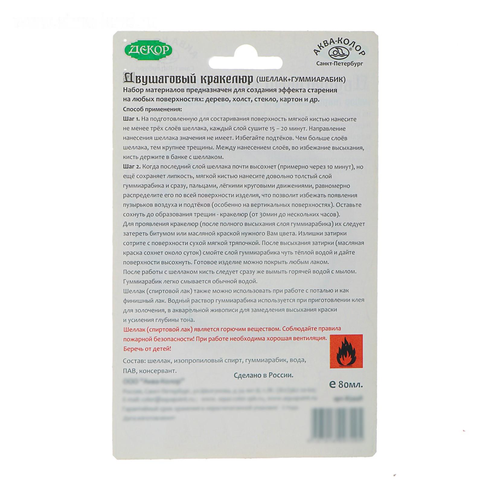 Лак кракелюрный, двухшаговый, 2 штуки по 40 мл, «Аква-Колор» (шеллак и гуммиарабик)