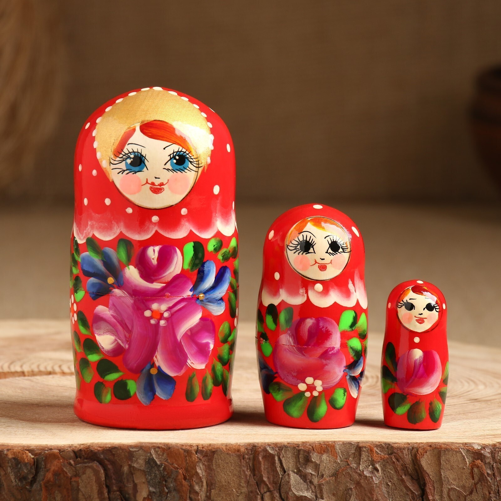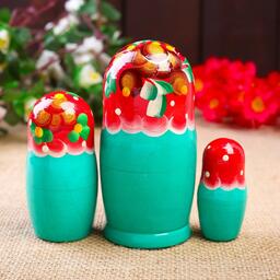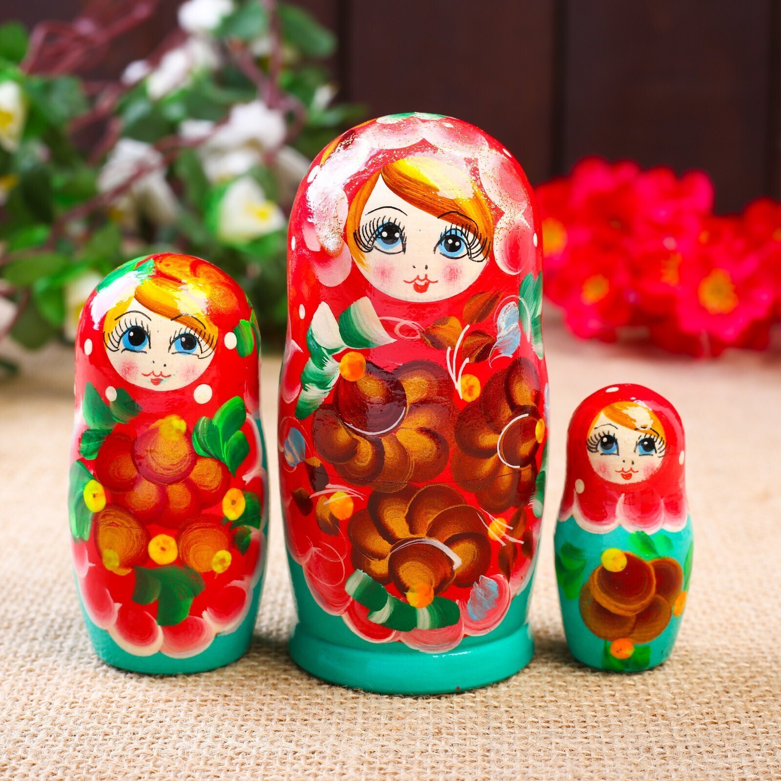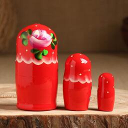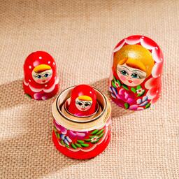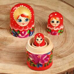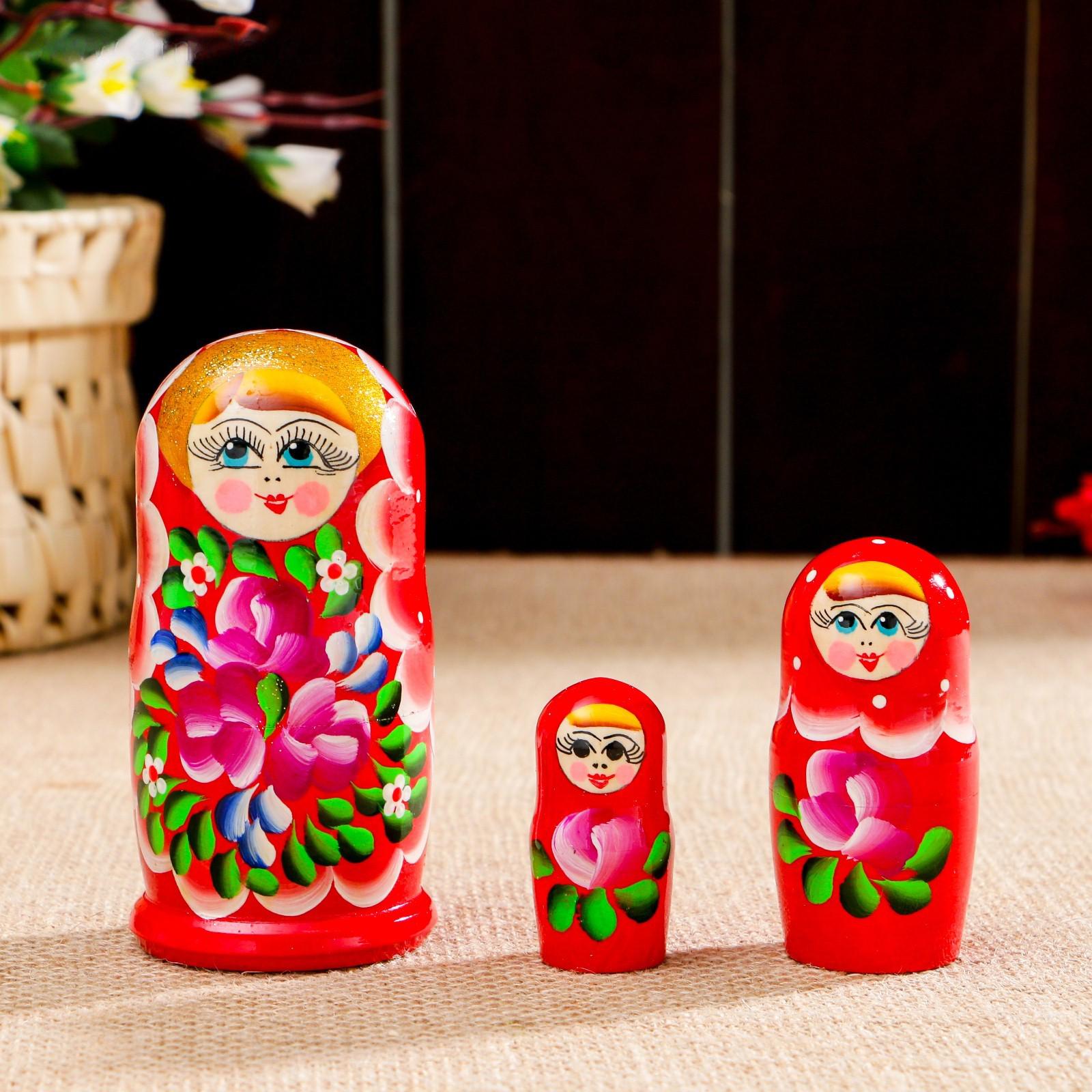 Матрёшка «Цветочки», красный платок, 3 кукольная, 10 см