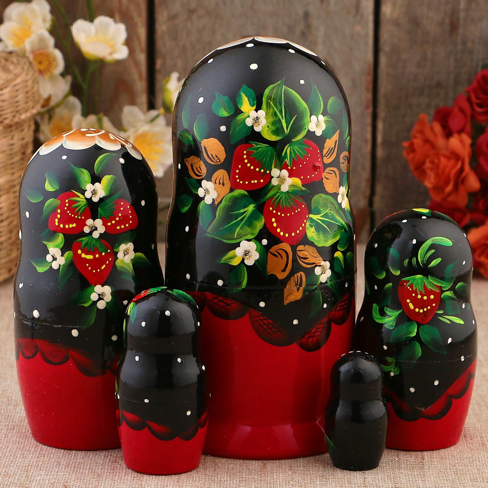 Матрёшка «Земляничка», чёрный платок, 5 кукольная, 18 см