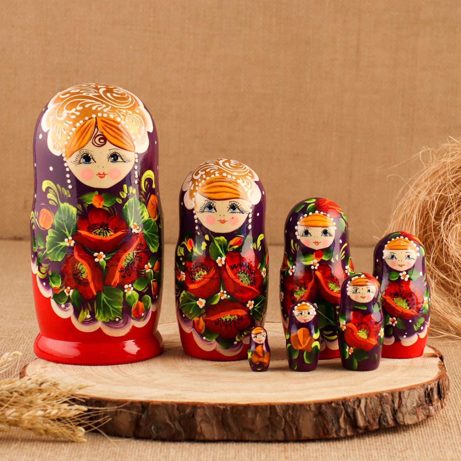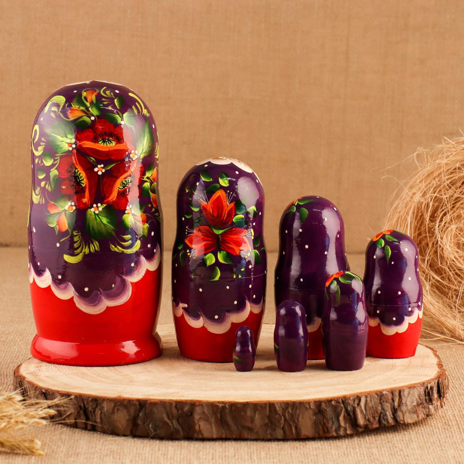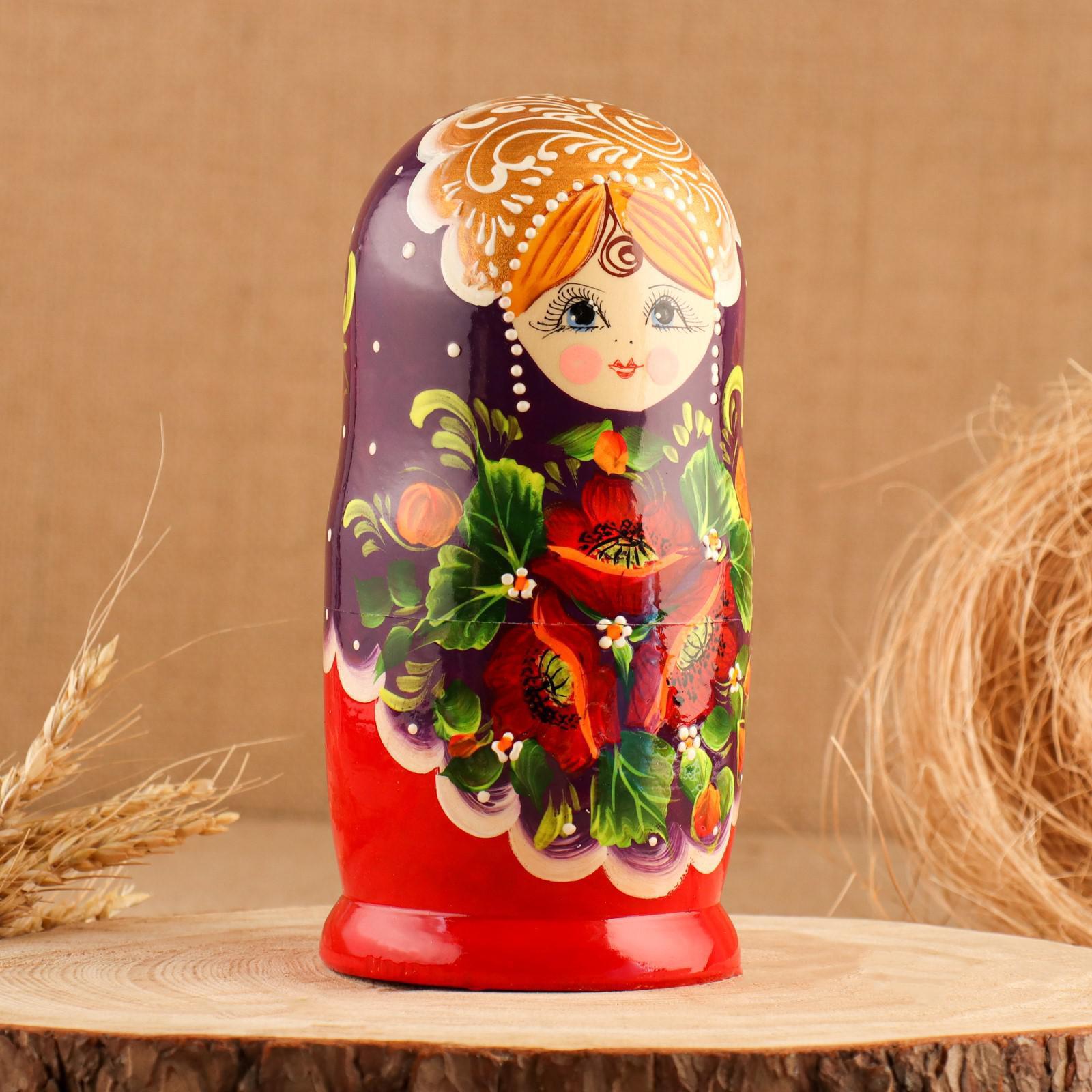 Матрешка "Маки", фиолетово-красная платок, 7-ми кукольная, 21 см