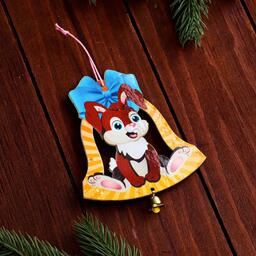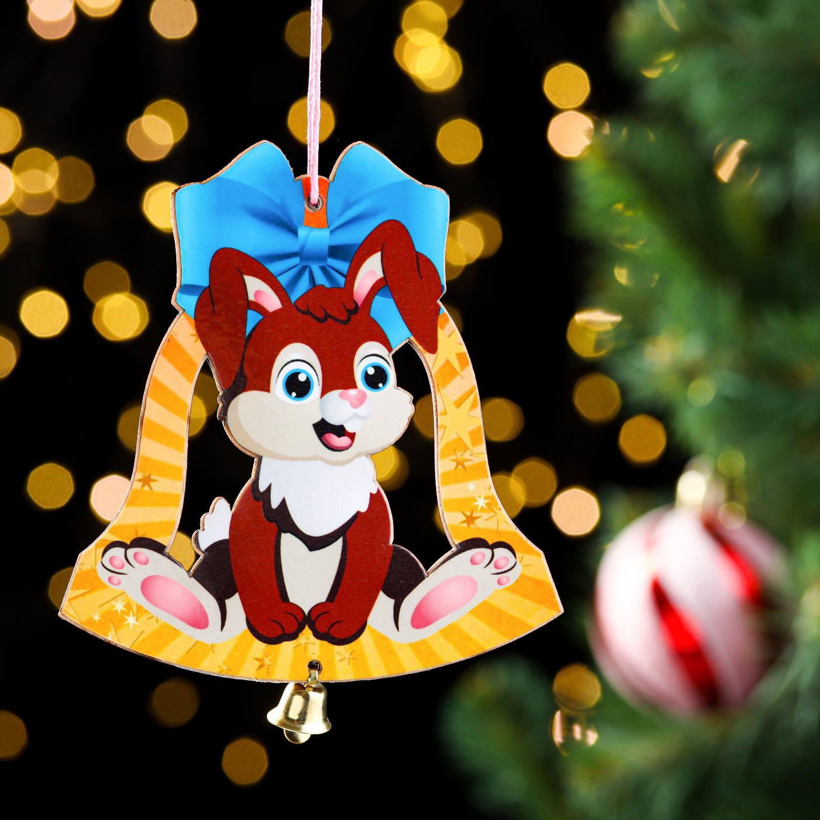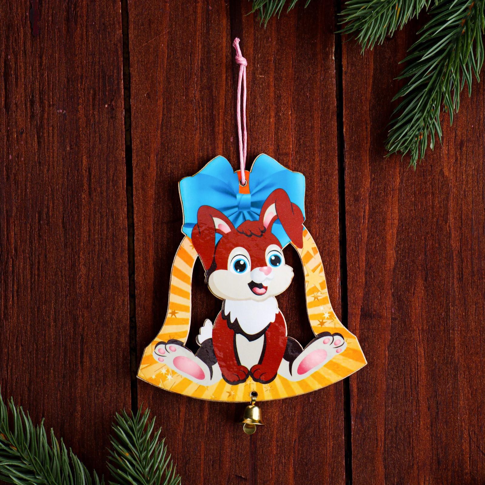 Ёлочная игрушка "Год Кролика. Кролик колокольчик" с колокольчиком, дерево, ламинация, 6,9х7,