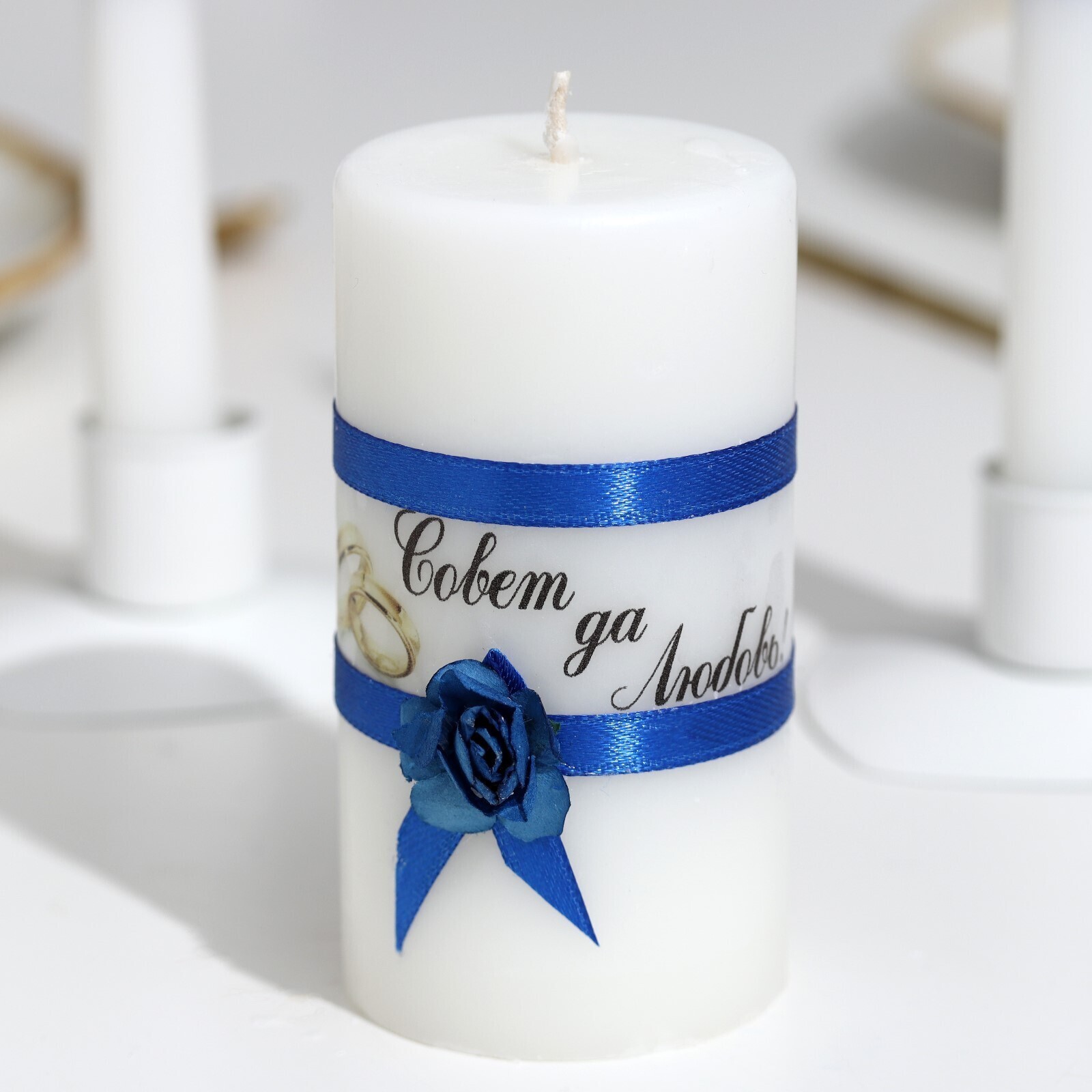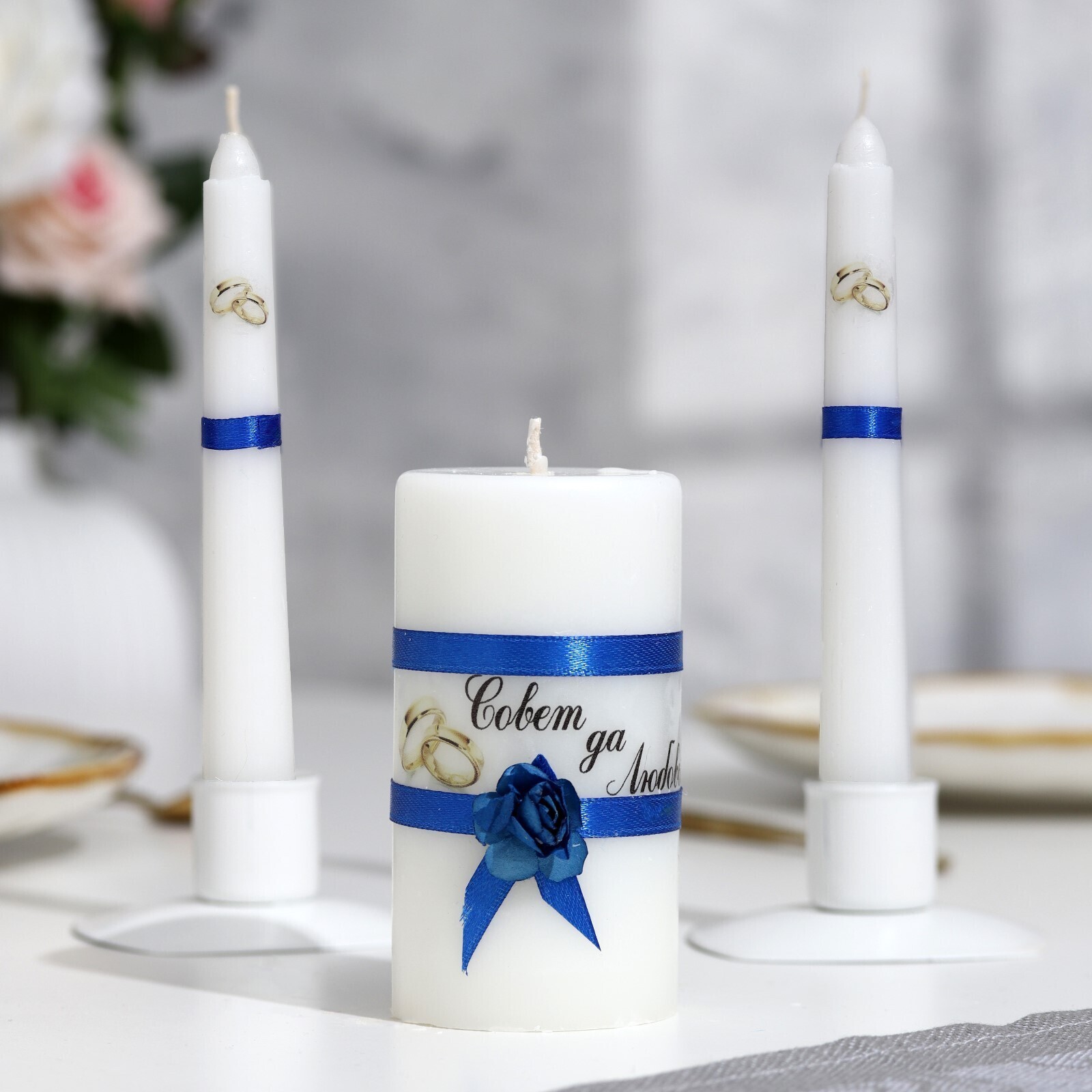 Набор свечей свадебных "Совет да любовь с розой"синий:родительские 1,8х15см,очаг 5х9,5см