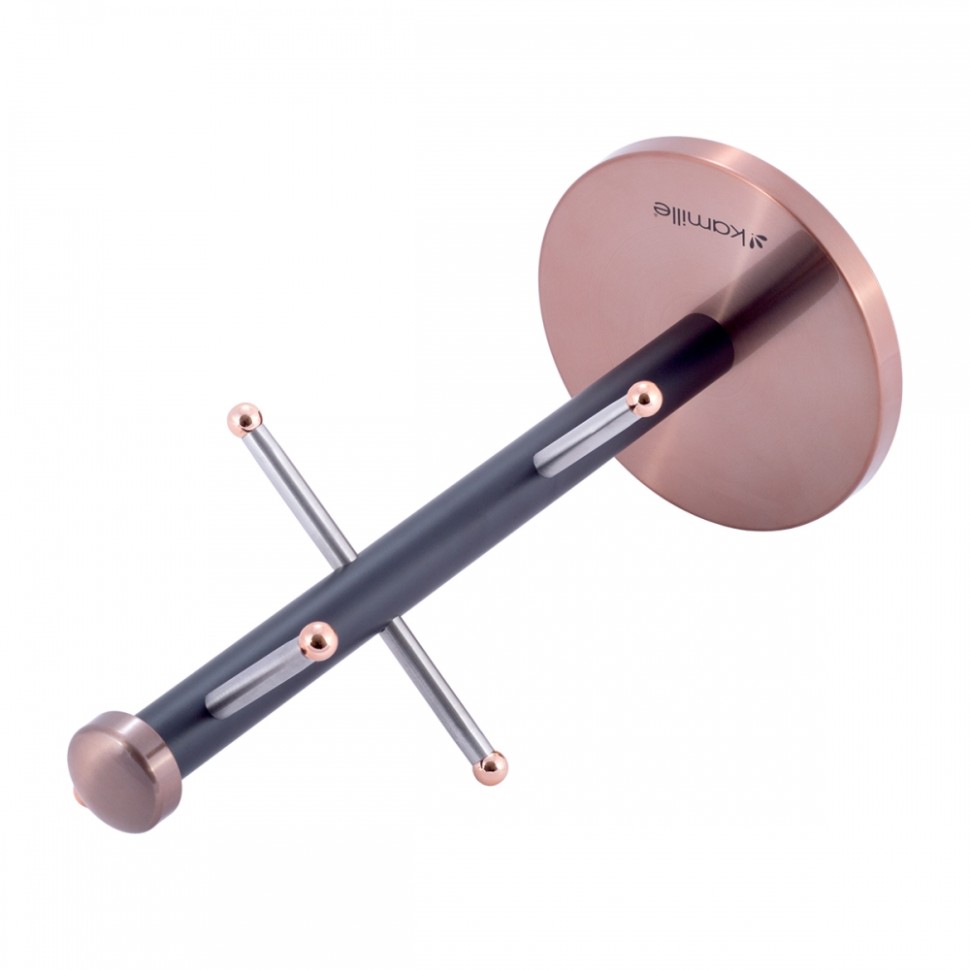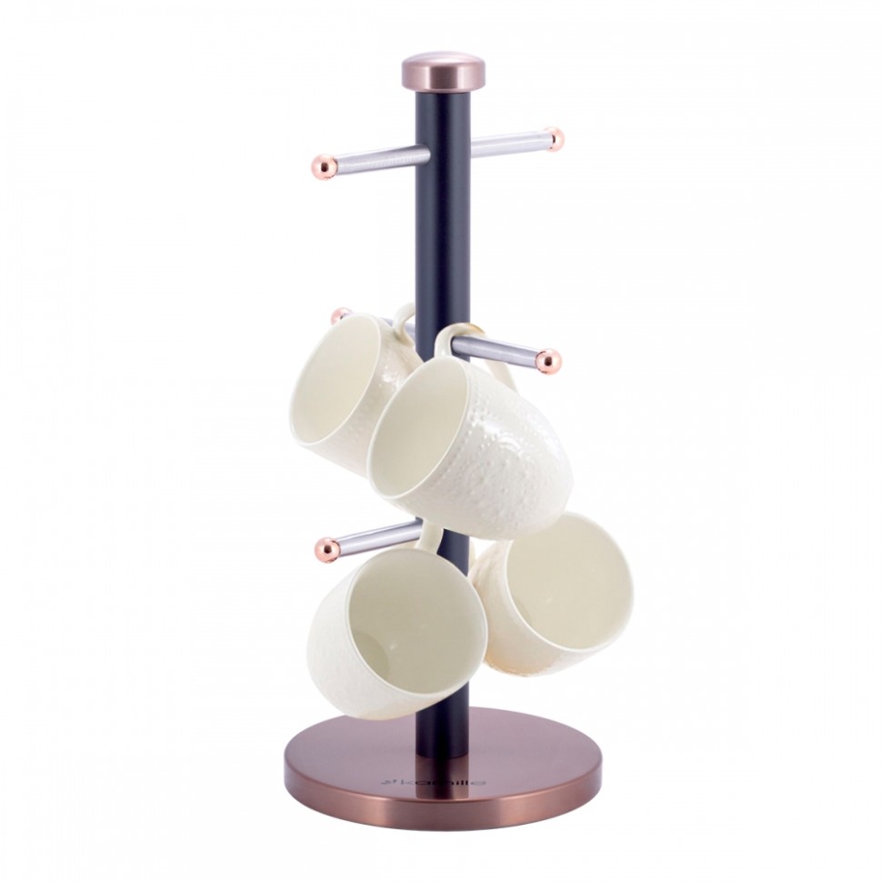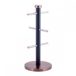 Заводская упаковка нарушена или отсутствует. Товар НОВЫЙ, в полной комплектации. / Стойка для чашек. Материал: нержавеющая сталь. Размеры: Ø15*34.5см. Цвет: чёрный с медным и серебристым. Способ установки: настольный. Вместимость чашек: 6. Полировка металла: зеркальная/сатин. Дополнительно: чёрная противоскользящая накладка. Упаковка: пакет.