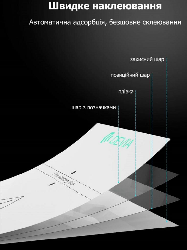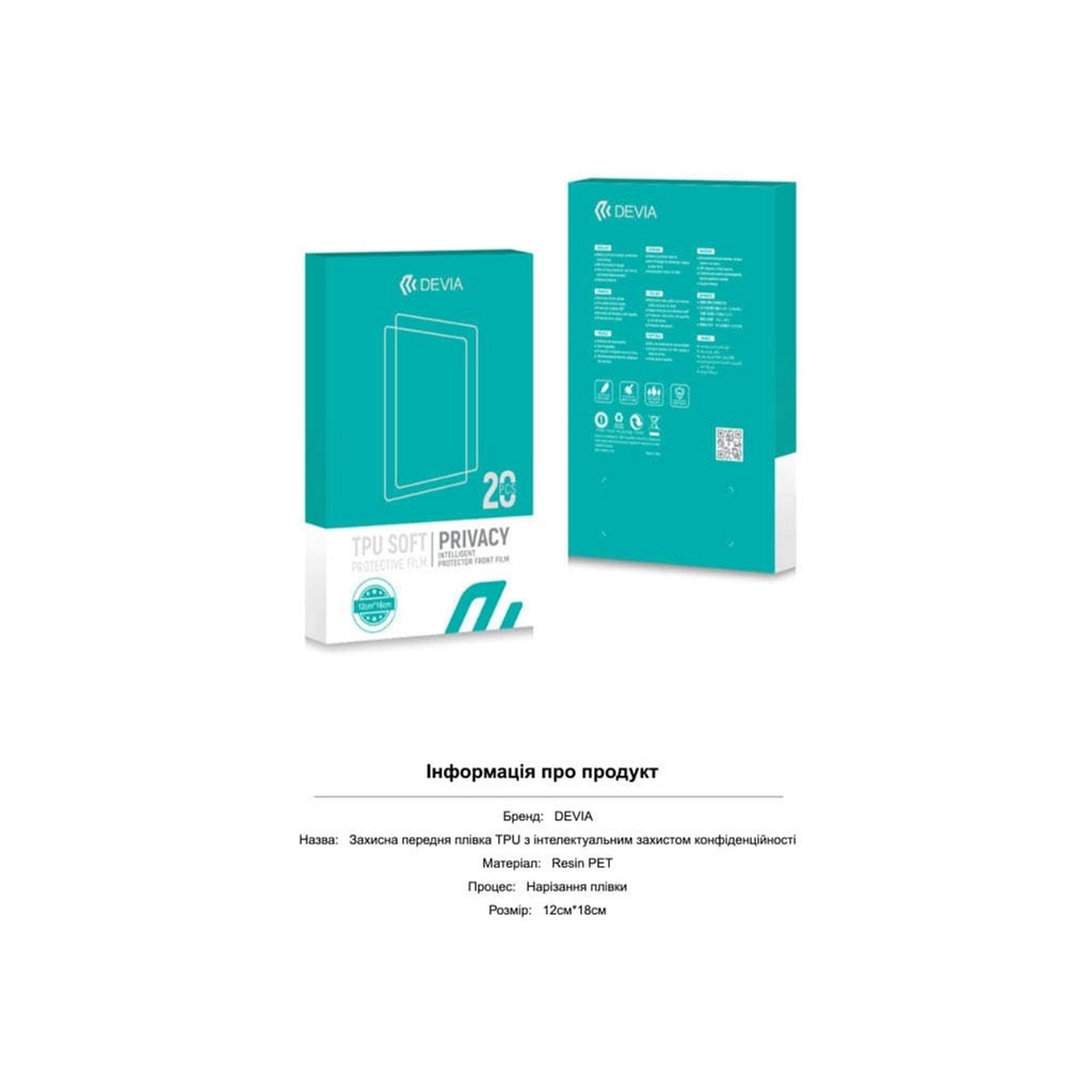Гідрогелева плівка Devia Privacy захистить ваш смартфон від пошкоджень, не тріскається під час падіння й не відколюється на краях. Завдяки функції антишпигун, ви можете приховати інформацію на вашому телефоні від інших людей.