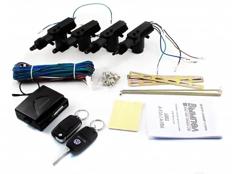 - В комплекте центральный блок (1 шт.), набор проводки (1 шт.), брелок (2 шт.), двухсторонний скотч (1 шт.), активатор блокировки замка (4 шт.), затворная штанга (4 шт.), фиксирующая пластина (4 шт.), направляющая для штанги (4 шт.), предохранитель (1 шт.), саморез (8 шт.), винт (12 шт.), руководство пользователя