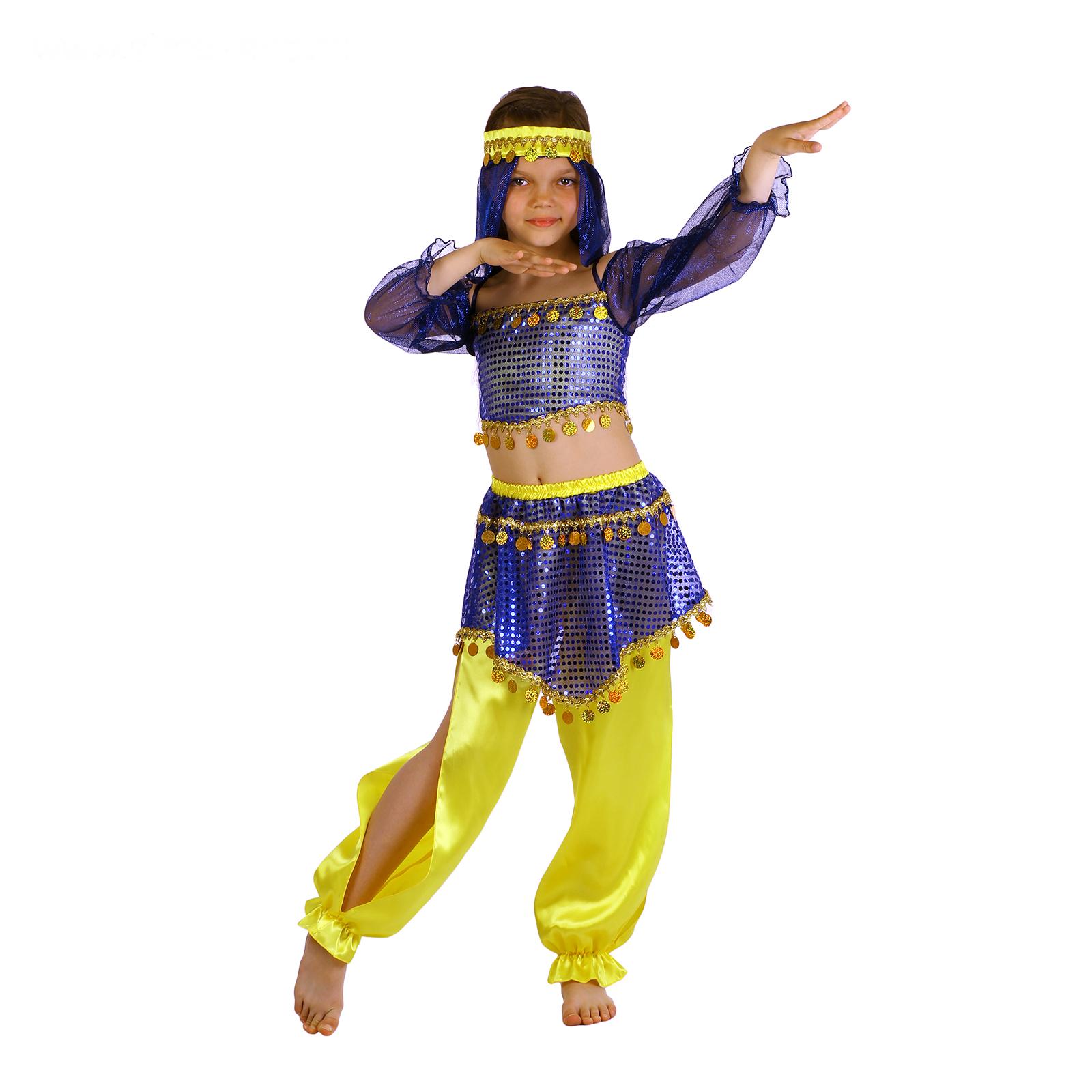 Карнавальный костюм "Восточная красавица. Шахерезада", топ с рукавами, штаны, повязка, цвет сине-жёлтый, р-р 34, рост 134 см