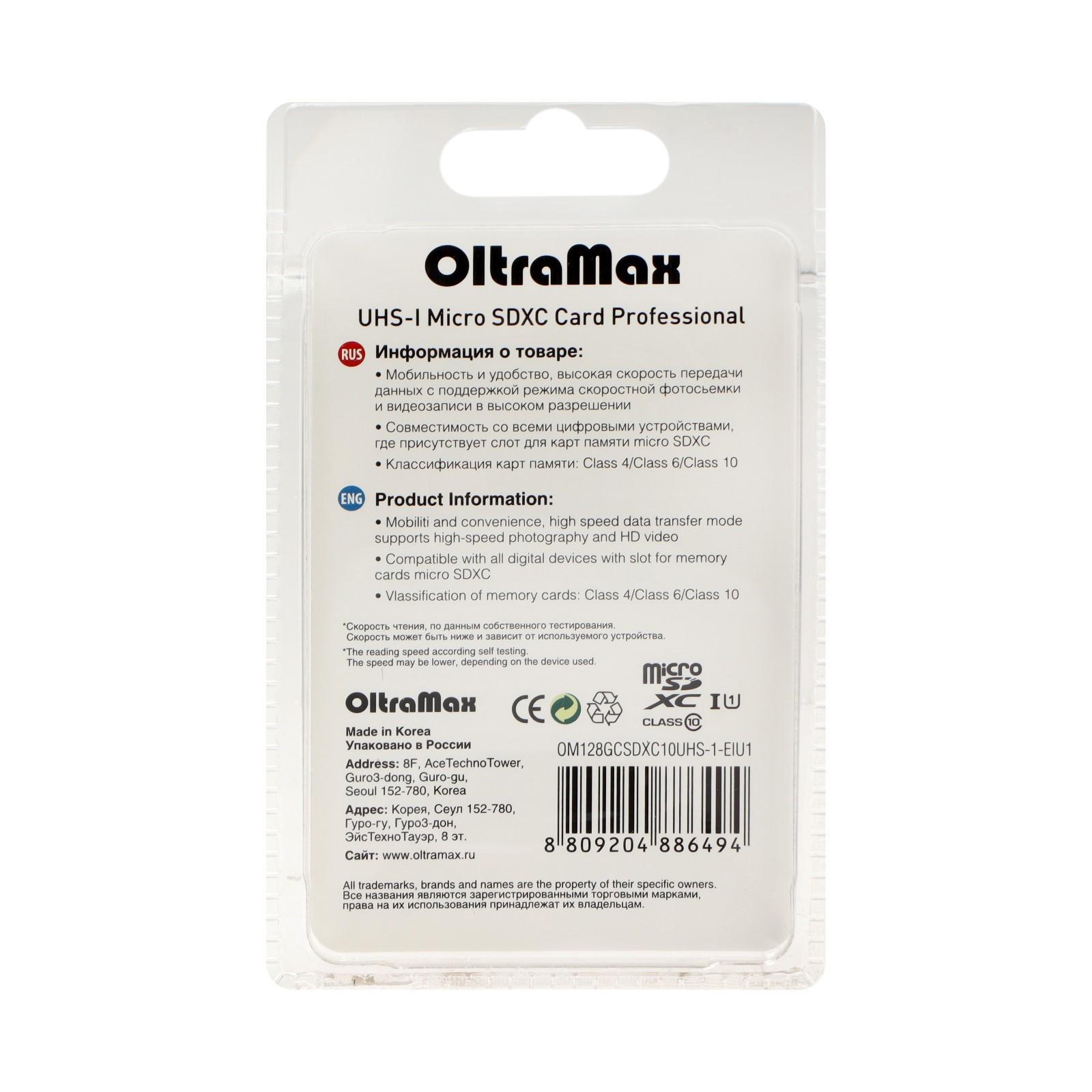 Карта памяти OltraMax MicroSD, 128 Гб, SDHC, UHS-1, класс 10, 45 Мб/с, с адаптером SD
