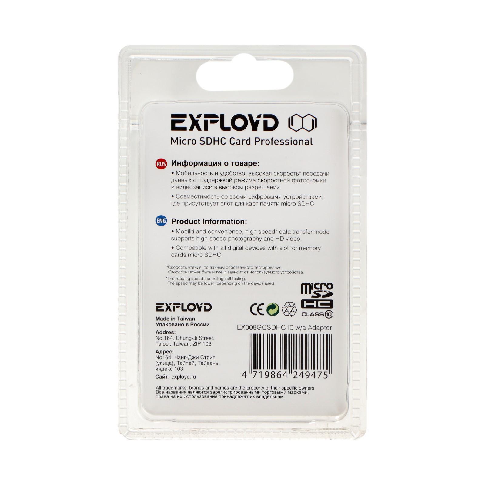 Карта памяти Exployd MicroSD, 8 Гб, SDHC, класс 10