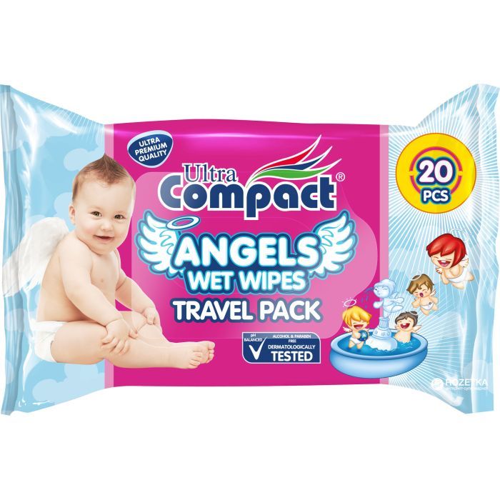 Дитячі вологі серветки Ultra Compact Angels Baby . Новинка, дитячі вологі серветки ультракомпакт просякнуті й очищені деіонізованою водою — 99.9% не містять спирту та парабенів.