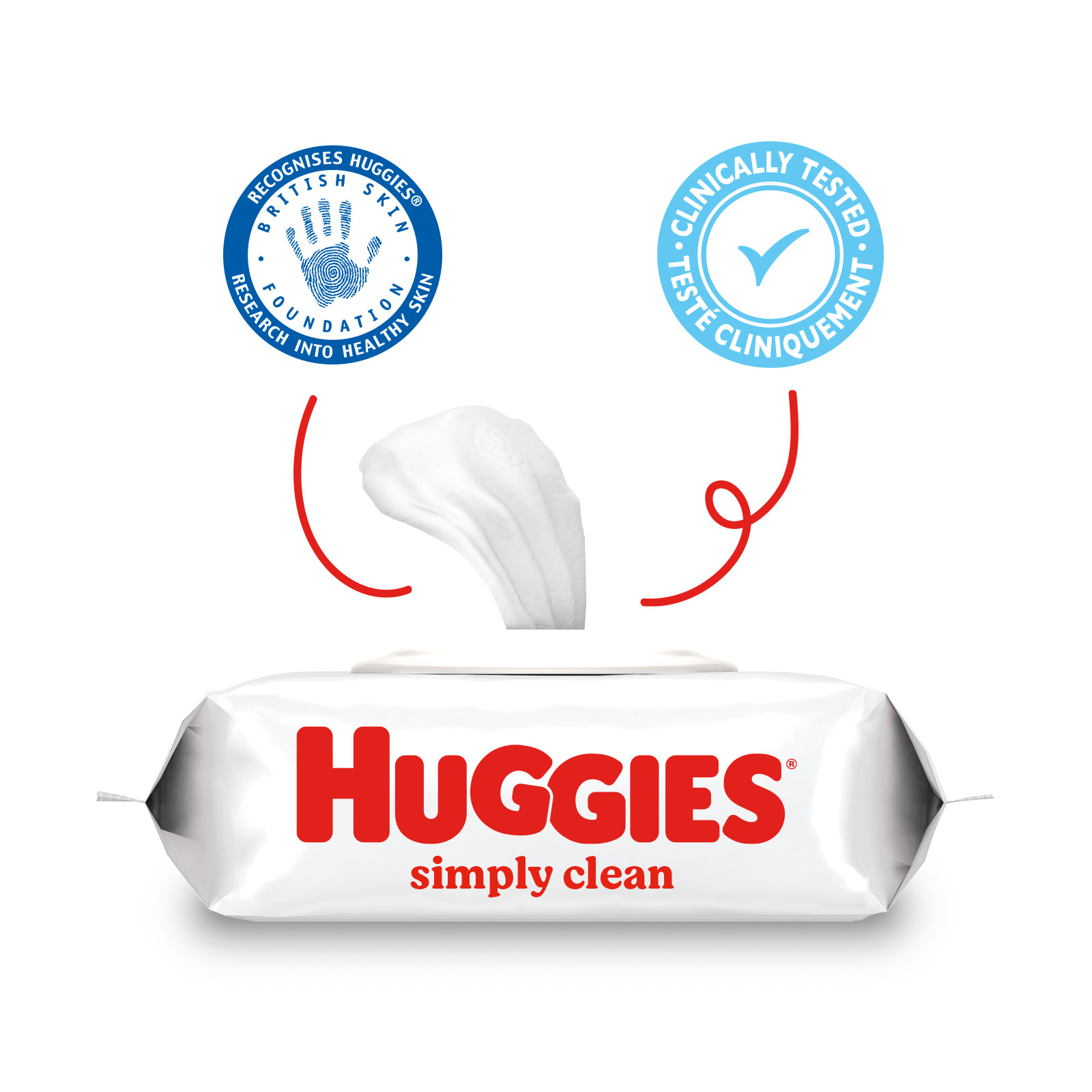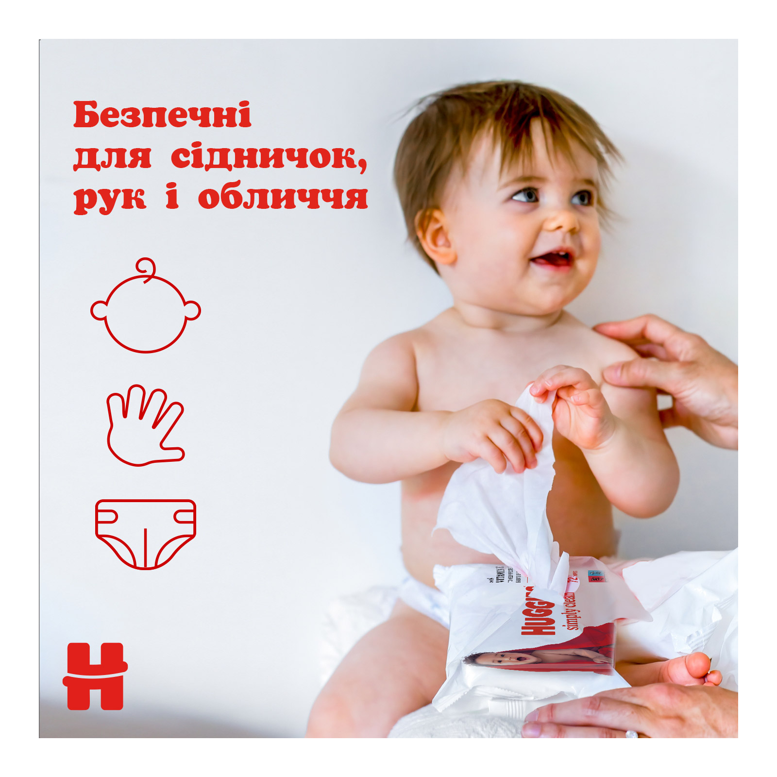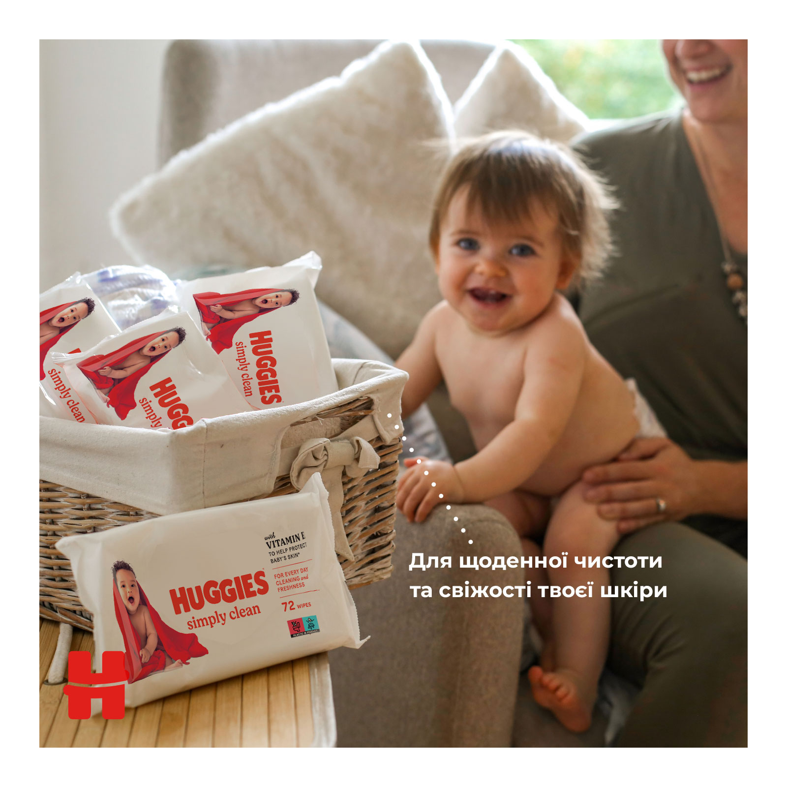 Вологі серветки Huggies Simply Clean ідеально підходять як для ніжної шкіри новонародженого малюка, так і для активних прогулянок з дорослими дітьми або в дорогу.