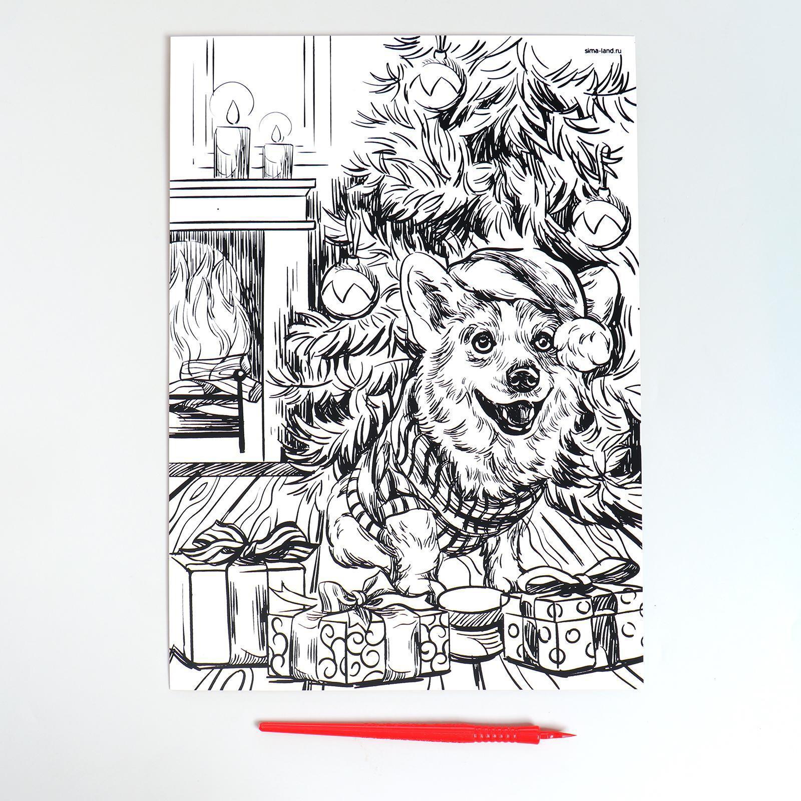 Гравюра «Собачка у ёлки» A4, с металлическим эффектом «золото»