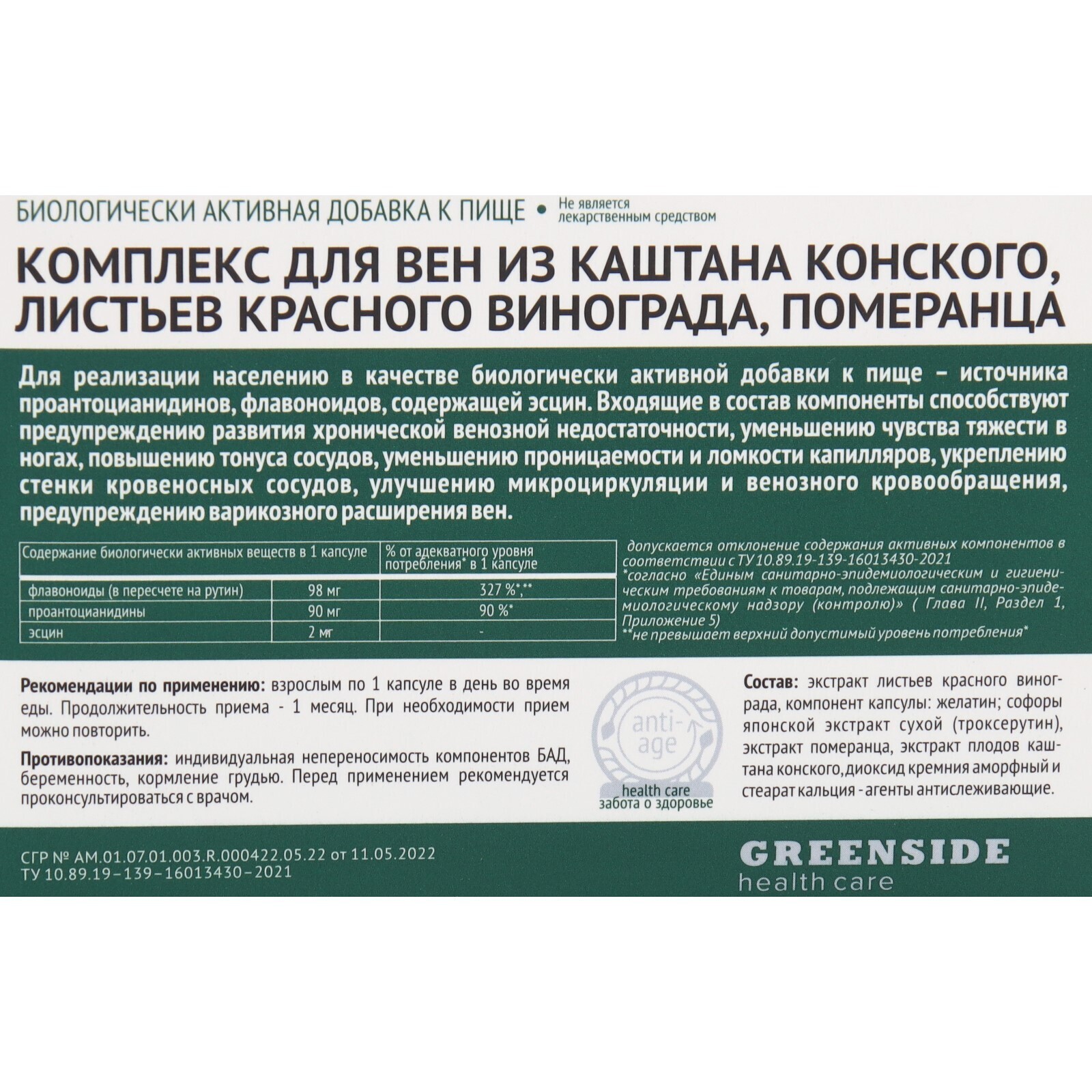 Комплекс для вен из каштана конского, листьев красного винограда, померанца,30 капсул, 450 м