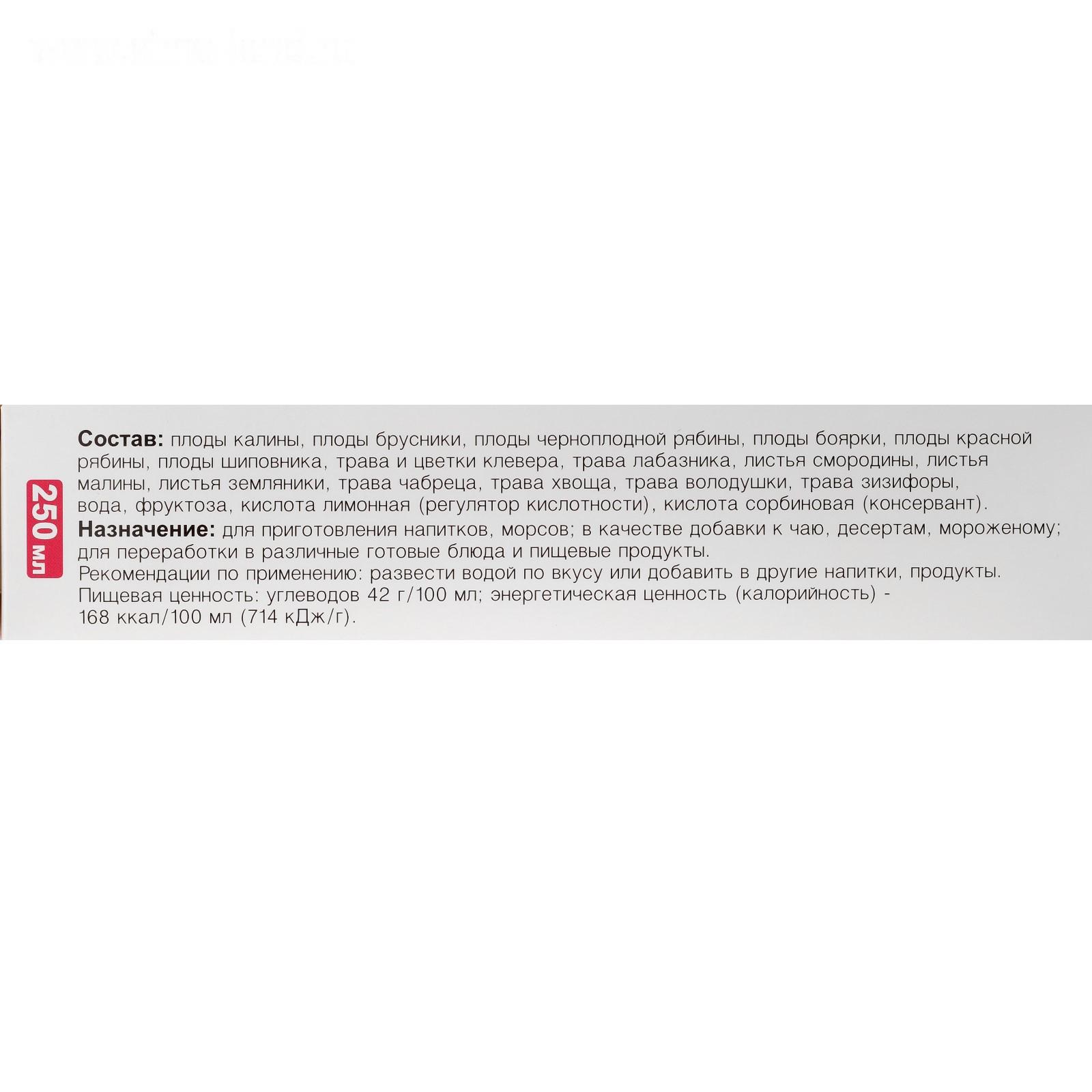 Состав: плоды калины, плоды брусники, плоды черноплодной рябины, плоды боярышника, плоды красной рябины, плоды шиповника, трава и цветки клевера, трава лабазника, листья смородины, листья малины, листья земляники, трава чабреца, трава хвоща, трава володушки, трава зизифоры, фруктоза, кислота лимонная, кислота сорбиновая.