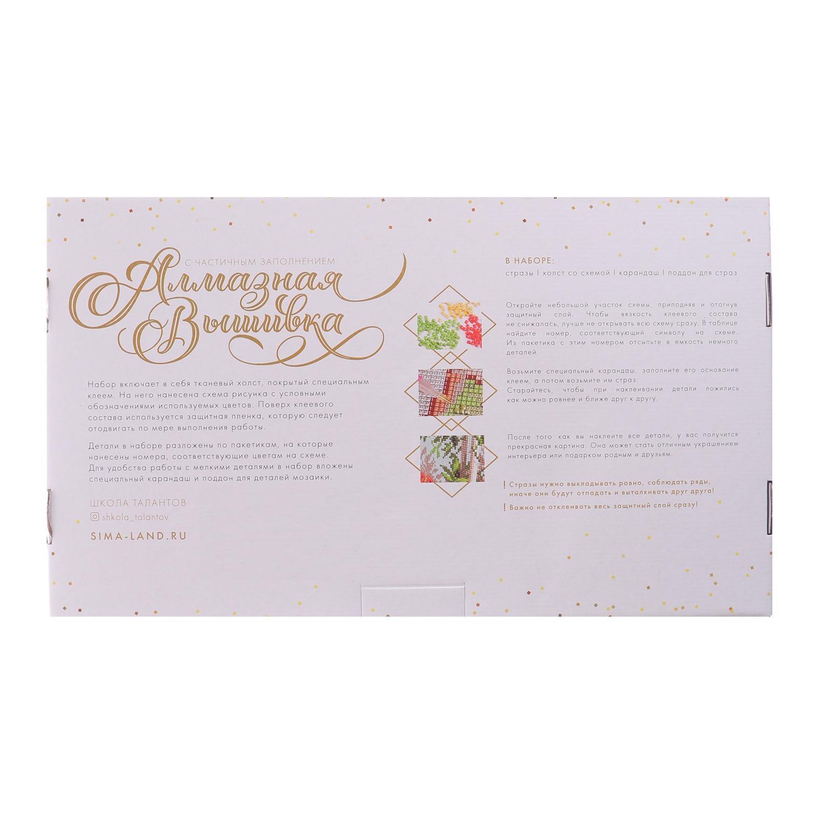 Часть изображения предстоит заполнить стразами, другая часть напечатана на холсте-основе. Поэтому набор подойдёт для тех, кто впервые пробует свои силы в этой технике или любит быстро добиваться результата.