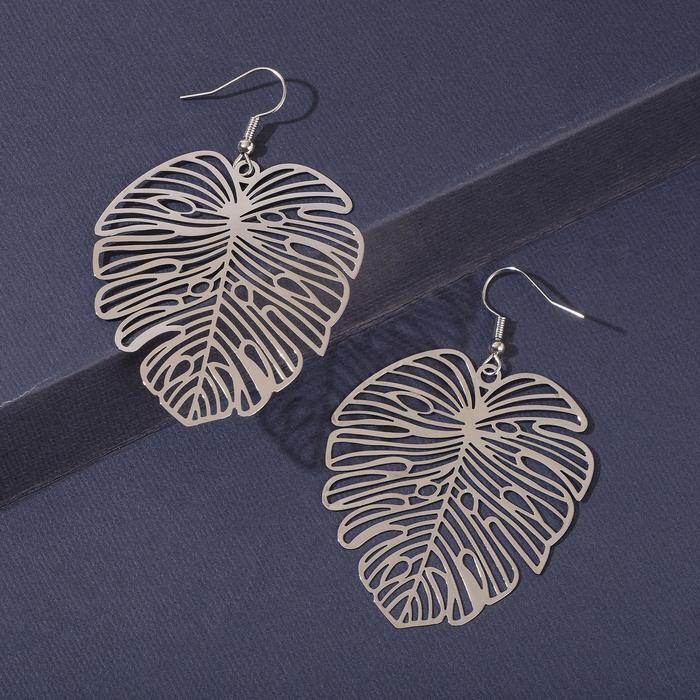 Серьги металл "Монстера" листочек, цвет серебро