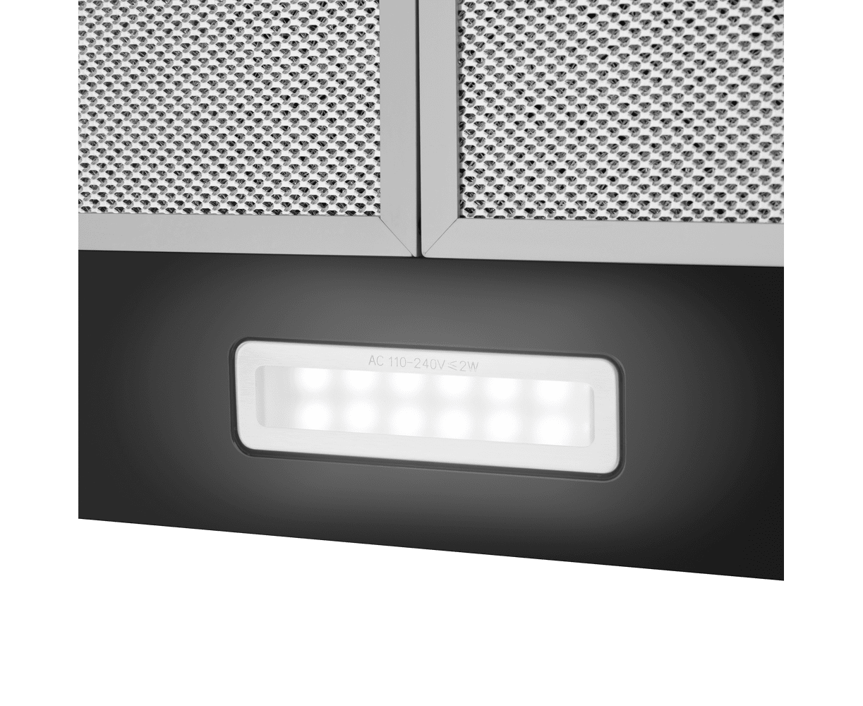 Кнопочная система управления вытяжки, находящаяся на правой части фронтальной панели, позволяет выбрать один их 3-х режимов работы и включить освещение. Для подсветки варочной поверхности используется 1 светодиодный источник мощностью 2 Вт.