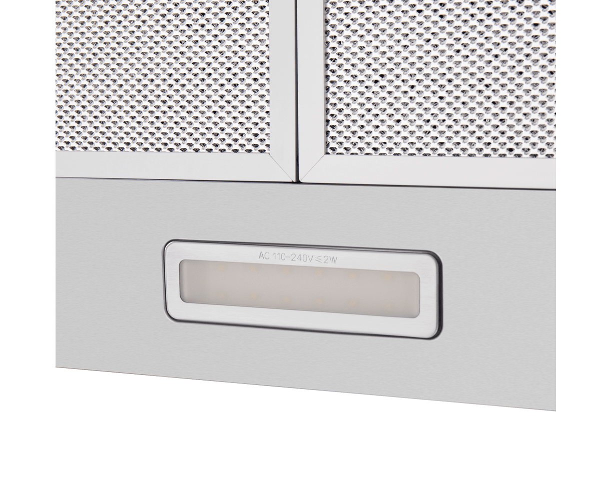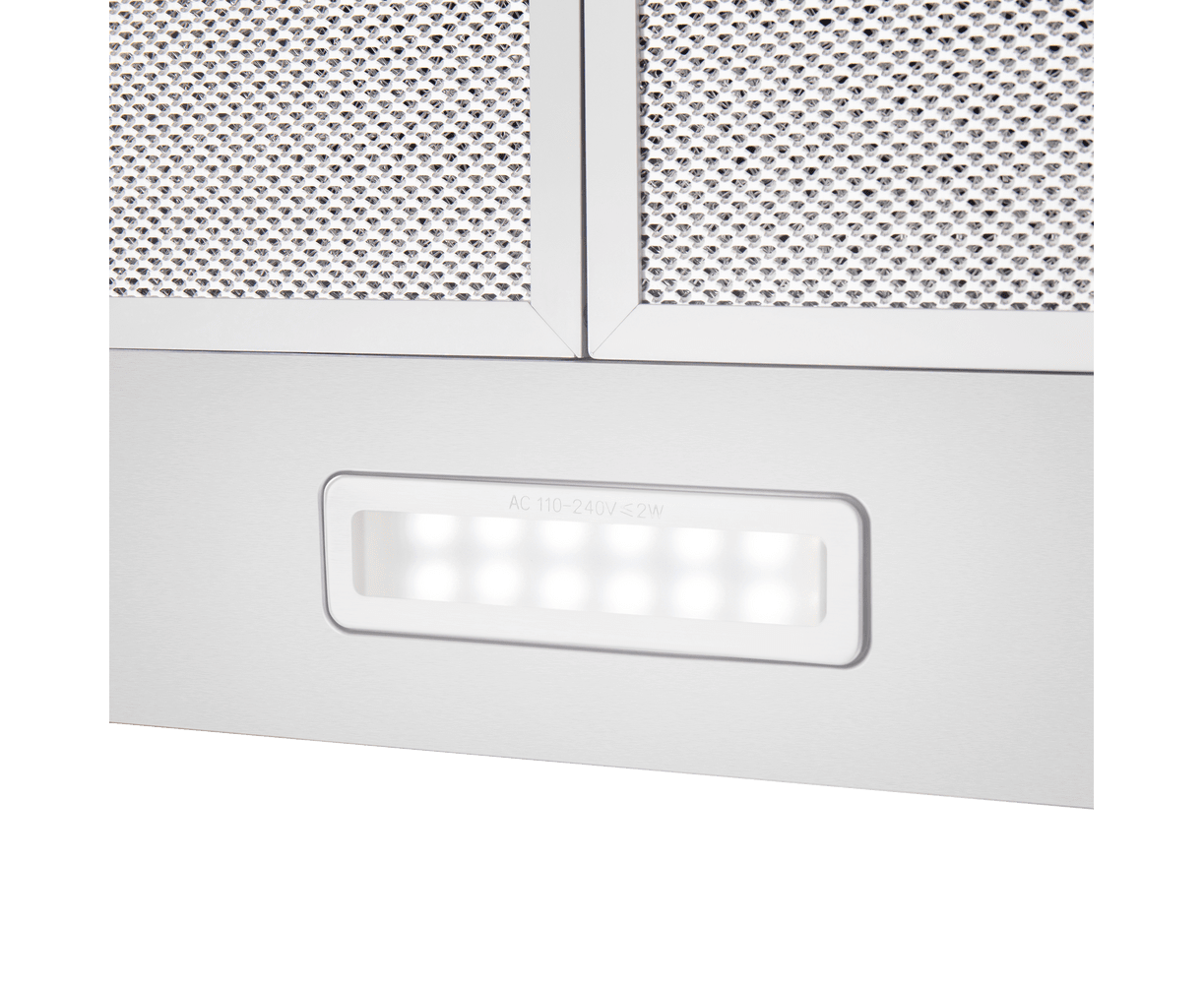 Кнопочная система управления вытяжки, находящаяся на правой части фронтальной панели, позволяет выбрать один их 3-х режимов работы и включить освещение. Для подсветки варочной поверхности используется 1 светодиодный источник мощностью 2 Вт.