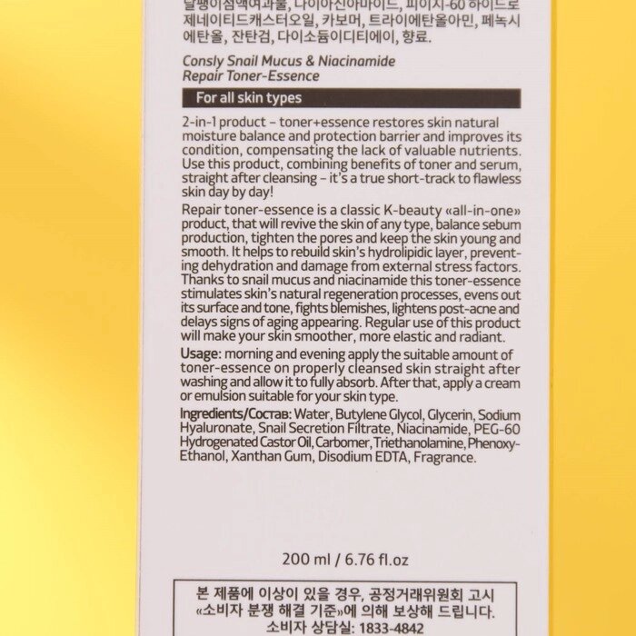 Восстанавливающий тонер-эссенция Consly с муцином улитки и ниацинамидом, 200 мл