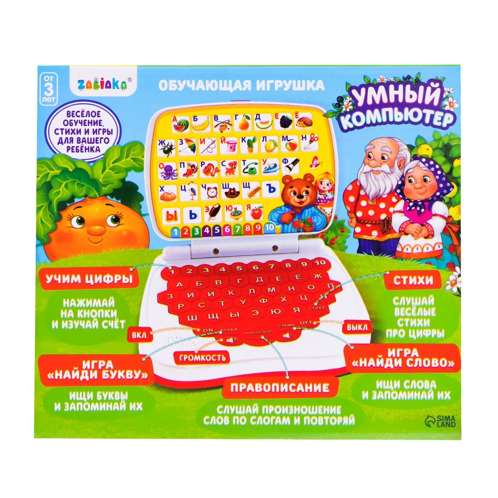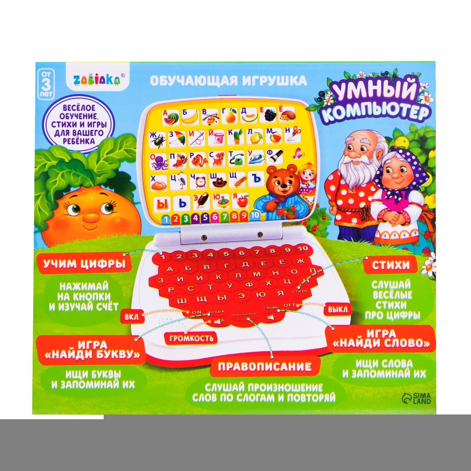 «Умный компьютер» — это увлекательная развивающая игрушка, которая познакомит малыша с алфавитом, цифрами, основами счёта, правописания и логики, а также развлечёт стихами. Детский гаджет способствует улучшению памяти, логического мышления, цветового и звукового восприятия.
