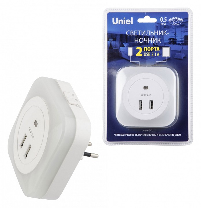 • Дополнительная информация Производитель Uniel. Компоненты, входящие в комплект - вилка, 2 USB-порта 5В 2.1А. Основной цвет - разноцветная