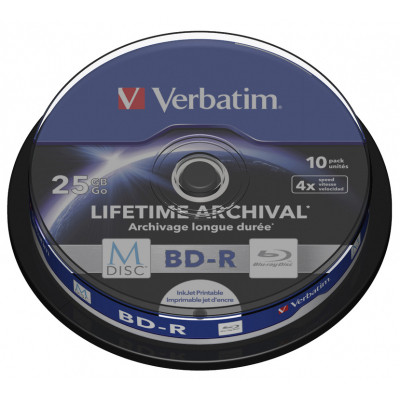 Диск BD-R Verbatim 25Gb 4x Cake 10pcs Printable M-DISC (43825)Професійні оптичні носії Verbatim перевершують вимоги та стандарти, прийняті відповідними органами стандартизації. Більш жорсткі вимоги забезпечують набагато кращу сумісність з різними видами дисководів і засобів запису. Підсумком цього є більш висока якість запису, а це значить, більш довгий термін зберігання даних і найкраща счітиваемость.Технологія M-Disc компанії Verbatim - це новий стандарт якості в області зберігання цифрових даних. Вона гарантує збереження інформації у разі спеціального захисного шару, який стійкий до впливу світла, температури і вологості. Відповідно до випробувань за стандартом ISO / IEC 10995, проведеним компанією Millenniata, очікуваний термін служби DVD-диска M-Disc склав 1332 роки, і лише 5% з перевірених екземплярів продемонстрували ознаки втрати даних через 667 років. Таким чином, передбачуваний реальний термін служби таких дисків оцінюється в кілька сотень років. Перевага технології Blu-ray дозволило створити диски високої ємності, що відповідають вимозі швидко розвивається телебачення високої чіткості (HDTV). Диски Blu-ray отримали своe назву від технології, що використовує блакитний лазер. Лазерний промінь з укороченою довжиною хвилі має блакитний колір. Блакитний лазер має довжину хвилі 405 нм, на відміну від червоного лазера, що використовується в звичайних DVD, з довжиною хвилі 650 нм. Діскі Blu-ray дозволяють записати обсяг інформації, в 3-5 разів перевищує можливості звичайного диска DVD, і здійснювати запис, перезапис і відтворення відео високої чіткості.