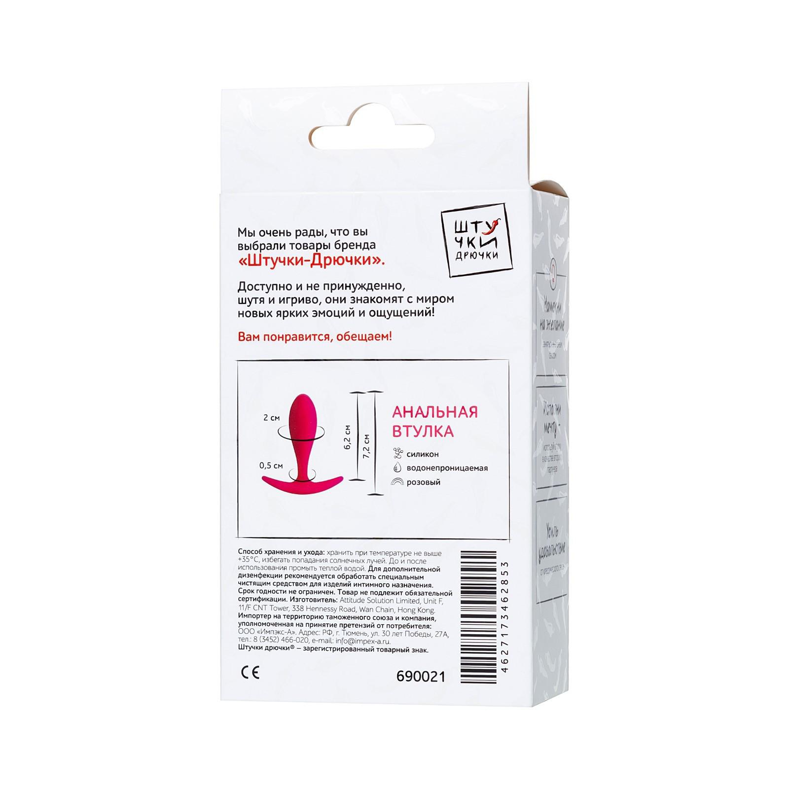 Анальная втулка водонепроницаемая, силикон, розовая, 7,2 см, d 2 см