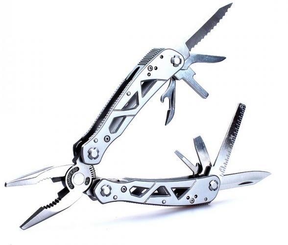 - Инструменты два ножа: с прямой и серрейторной режущей кромкой, шило, линейка, открывалки для банок и бутылок, одна крестовидная и две плоских отвертки.