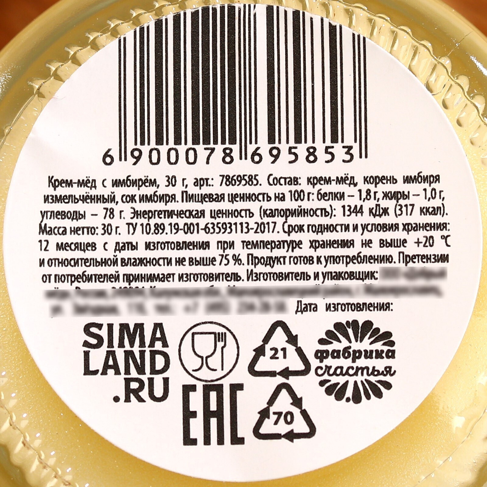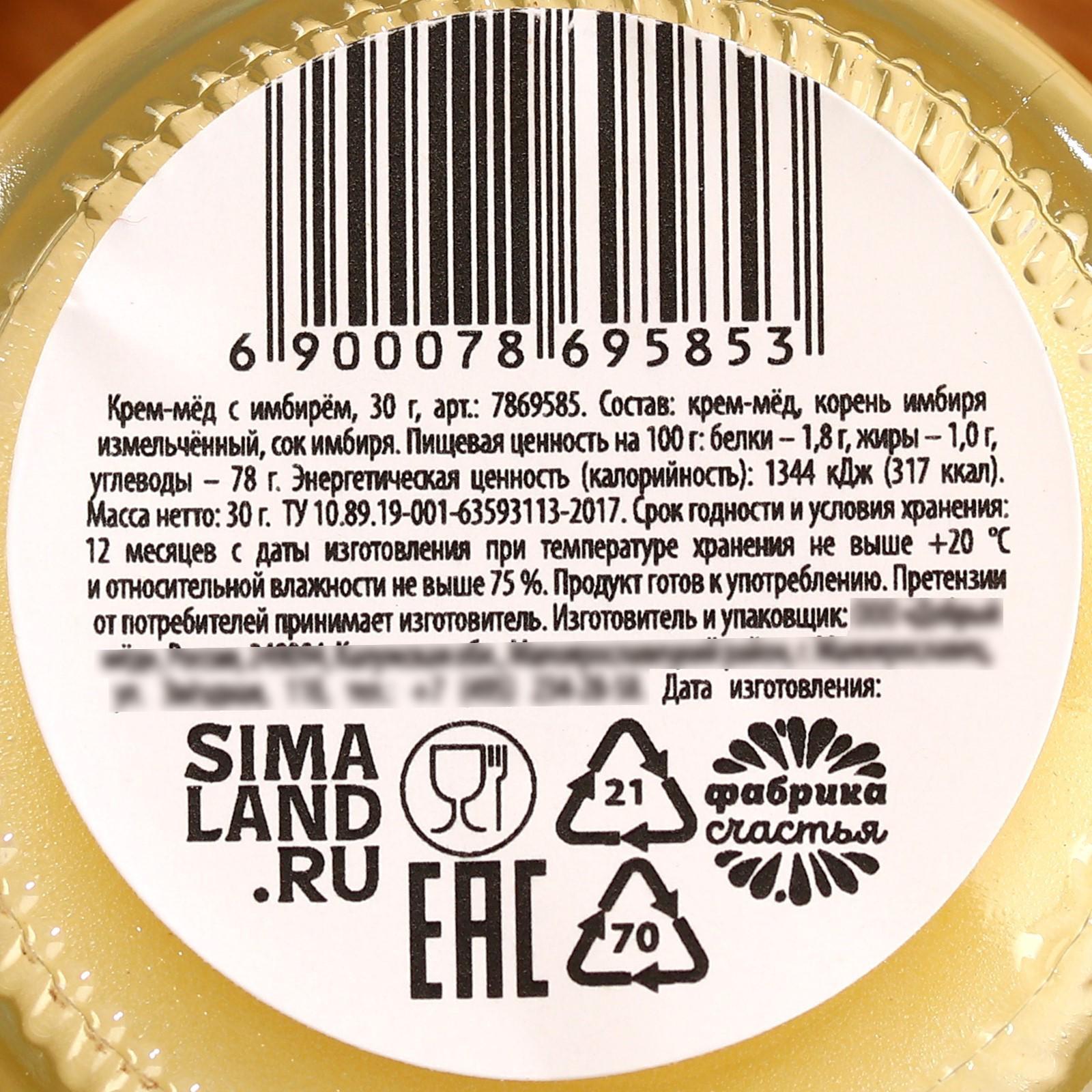 Состав: крем-мёд, корень имбиря измельчённый, сок имбиря.