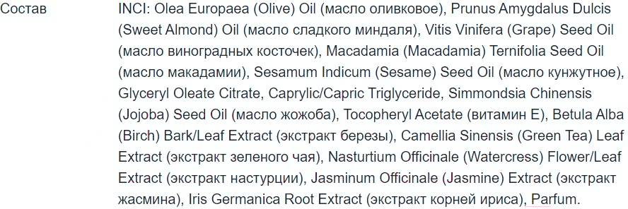 - Активные ингредиенты масло жожоба, экстракт зеленого чая, витамин Е, масло виноградной косточки, масло макадамии, масло миндаля, экстракт ириса, экстракт жасмина, экстракт березы, масло оливы, масло кунжута, экстракт настурции