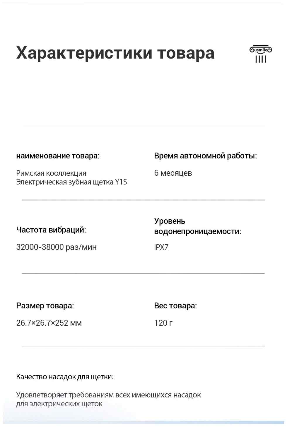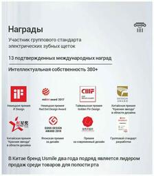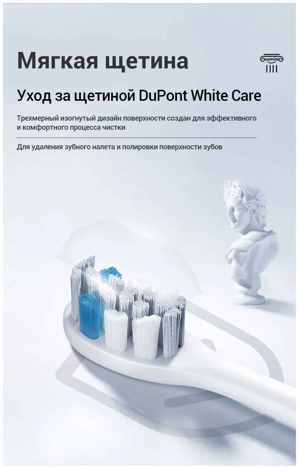 Электрическая зубная щетка Usmile Y1S - это вибрационная щетка для взрослых, она обеспечивает качественный и своевременный уход за полостью рта, устройство работает на базе технологий звуковых колебаний, которые позволяют проникать и очищать даже самые труднодоступные места. Щётка поддерживает три режима работы – режим ежедневной чистки, отбеливания и деликатной чистки. Имеет в комплекте три сменные насадки с разным спектром воздействия: стандартная, отбеливающая, мягкая. Отбеливающая насадка позволяет проводить отбеливание зубов в домашних условиях. Мягкая (деликатная) щетка бережно заботится о состоянии десен для тех, у кого чувствительные зубы и десна. Если у вас установлены брекеты, то щетка зубная электрическая – отличный выбор для ухода за ними. Мощная литиевая батарея обеспечивает до 180 дней работы без подзарядки. Соответствует стандарту IPX7 и может находится под струей воды в течение полуминуты. На корпусе девайса расположена кнопка, а также индикаторы состояния работы и выбранного режима. Автоматический таймер на 30 секунд напоминает, когда следует перейти к очистке следующей области, это позволяет всего за 2 минуты глубоко очистить и оздоровить зубы.