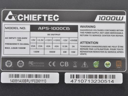Максимальная нагрузка (сила тока по линиям)Ток по линии +3.3 В: 25 A Ток по линии +5 В: 25 A Ток по линии +12 В 1: 104 A Ток по линии -12 В: 0.8 A Ток по линии +5 В Standby: 4 A