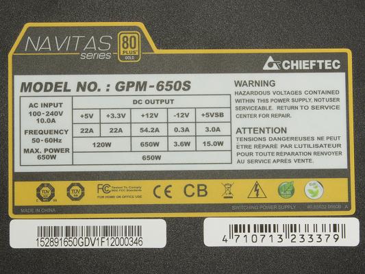 • Максимальная нагрузка (сила тока по линиям) +3.3V - 22A, +5V - 22A, +12V - 54.2A, +5VSB - 3.0A, -12V - 0.3A ; Комбинированная нагрузка: +3.3V & +5V - 120 Вт